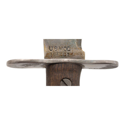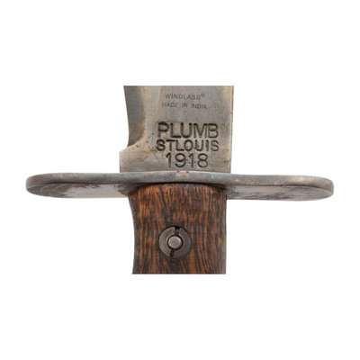 2.) 10.25" blade length. 16.25" overall with scabbard and hilt. Artificially aged metal finish overall with roughly finished walnut grip panels set in a canvas lined wood scabbard with stitched leather toe and brass throat. Ricasso is marked PLUMB/STLOUIS/1918 on the left side below the maker marking WINDLASS/MADE IN INDIA. Right ricasso displays model marking USMOD/1917C.T.