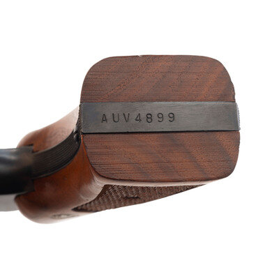 .22 LR. 4" barrel length. SN: AUV4899. Blued metal finish with color case hardened hammer and trigger and mounting Smith & Wesson medallion Walnut grips. Double action six-shot hand ejector revolver featuring a recessed cylinder on a three screw frame. Sights consist of an adjustable white outline rear notch and Baughman Quick Draw front ramp sights. Revolver shows standard make and model markings, including the monogram trade mark on the left frame, and four-line address to the right.
