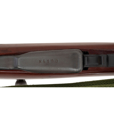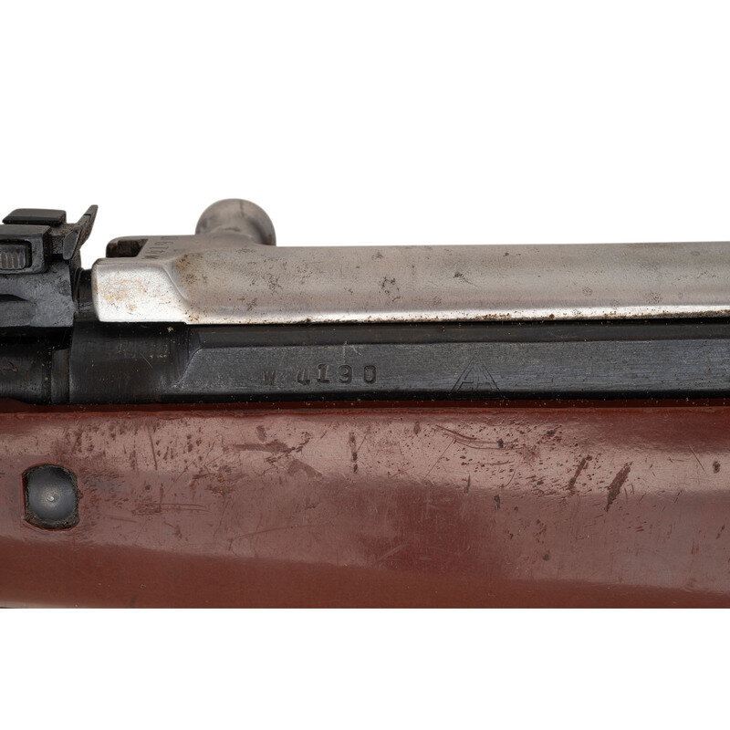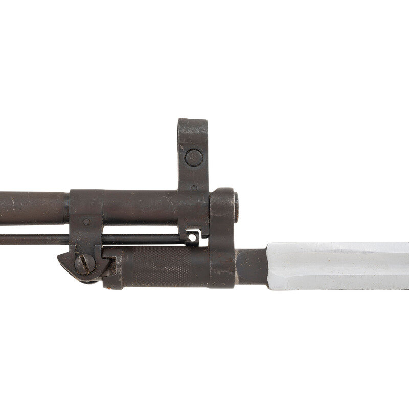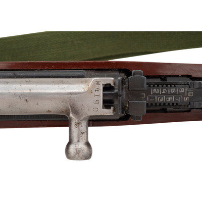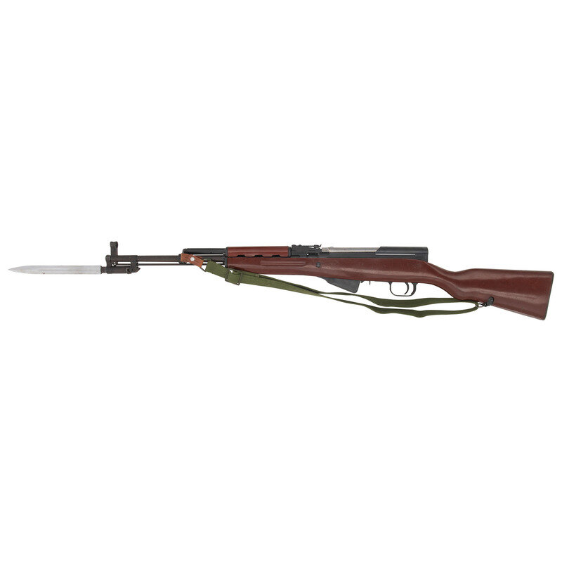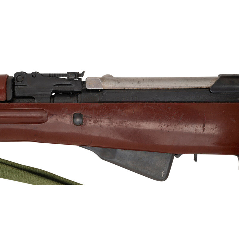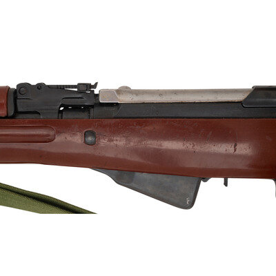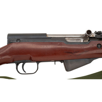 7.62x39mm. 20.5" barrel length. SN: W4190. Appears to have a parkerized finish to barrel and dull blued military finish to receiver and parts. Synthetic stock has a plain semi pistol grip and forearm, with handguard and grasping grooves. Gas operated semi automatic rifle with an adjustable tangent notch rear sight and globe post front sight. Item features a fixed folding blade bayonet, integrated magazine, trapdoor buttplate void of contents, and an OD sling. Markings include a triangle 26 markings to left side of receiver.