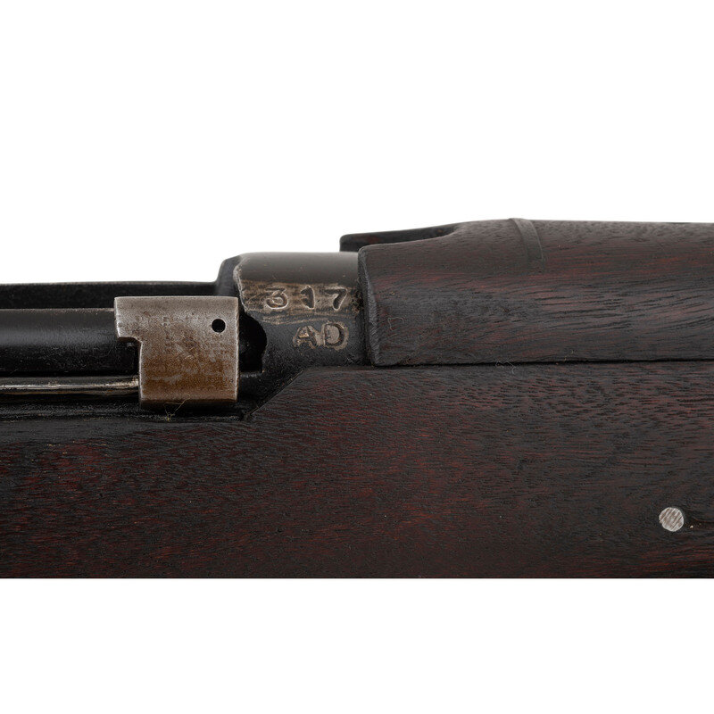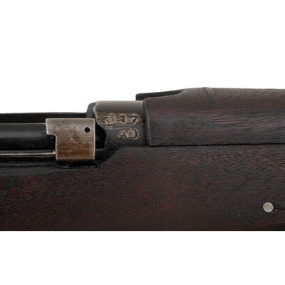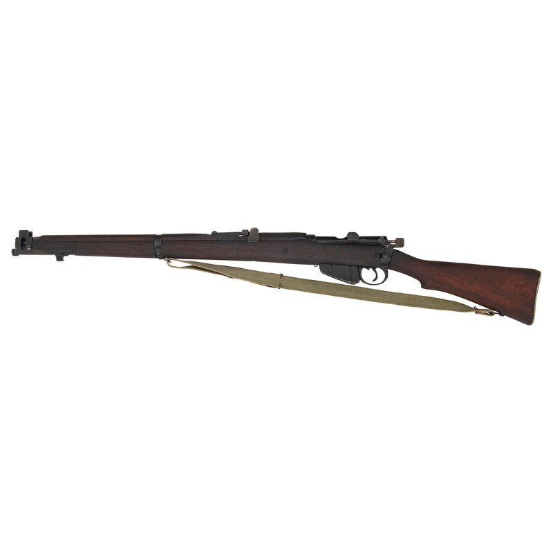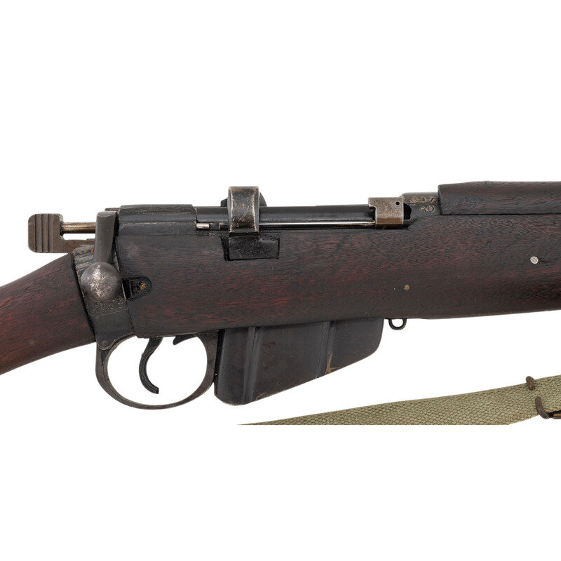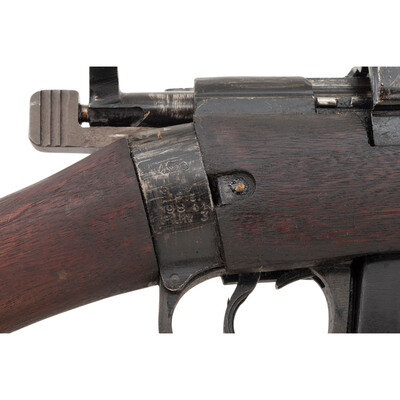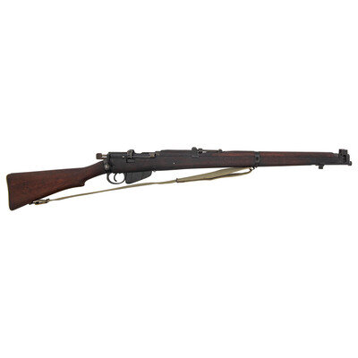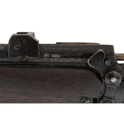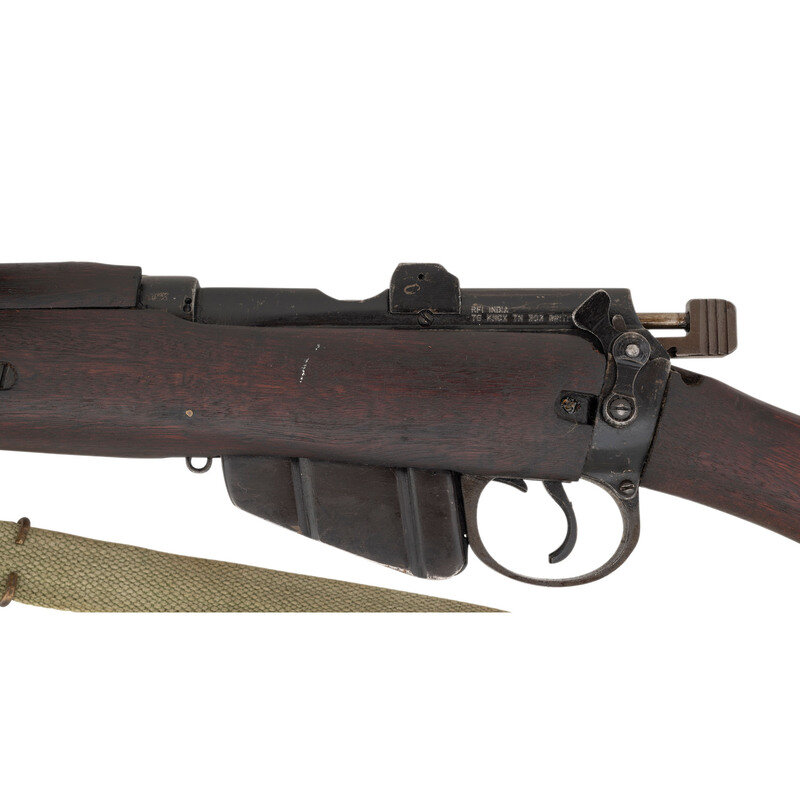 .303 British. 25.2" barrel. SN: 3179AD. Blackened finish, hardwood stock. Bolt action detachable magazine fed battle rifle with adjustable tangent rear sight to 2,000 yards, front sight blade with protective ears, bayonet lug and sling swivels. Matching numbers on forend cap, underside of forend, under rear sight ladder, on rear face of bolt handle and on receiver ring. Frame ring marked RFI/1988/No1. Mk3. Receiver import marked RFI INDIA/TO KNOX, TN 303 BRIT. Buttstock with a {Broad Arrow} between the letters SA. An OD green web sling is included.