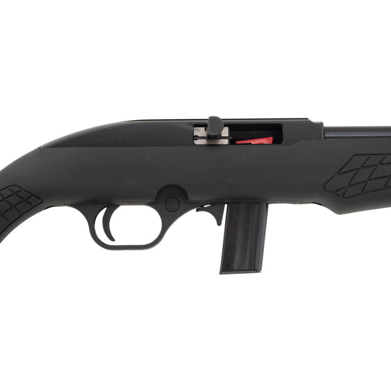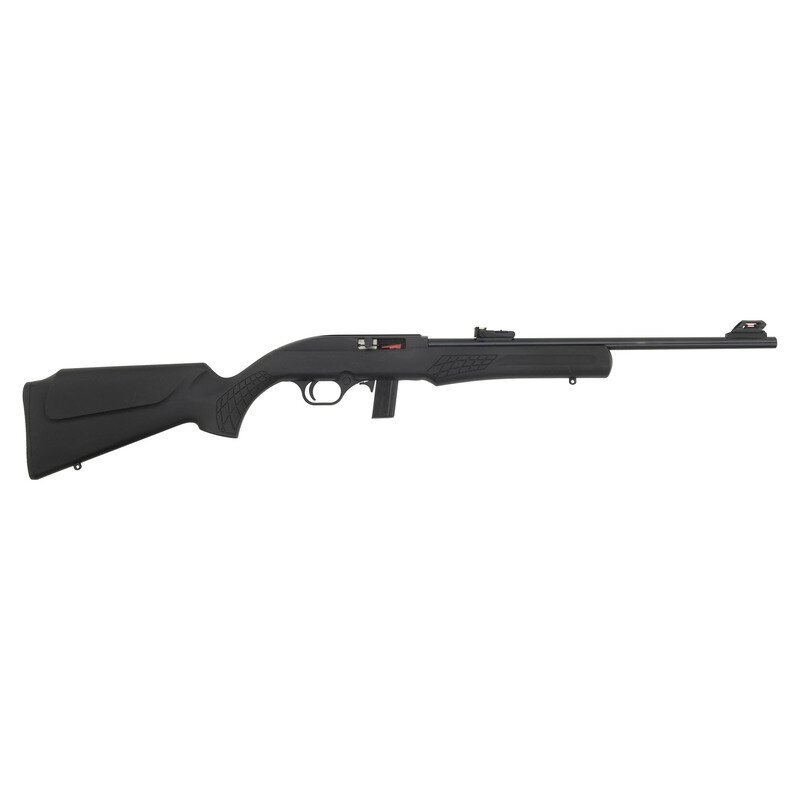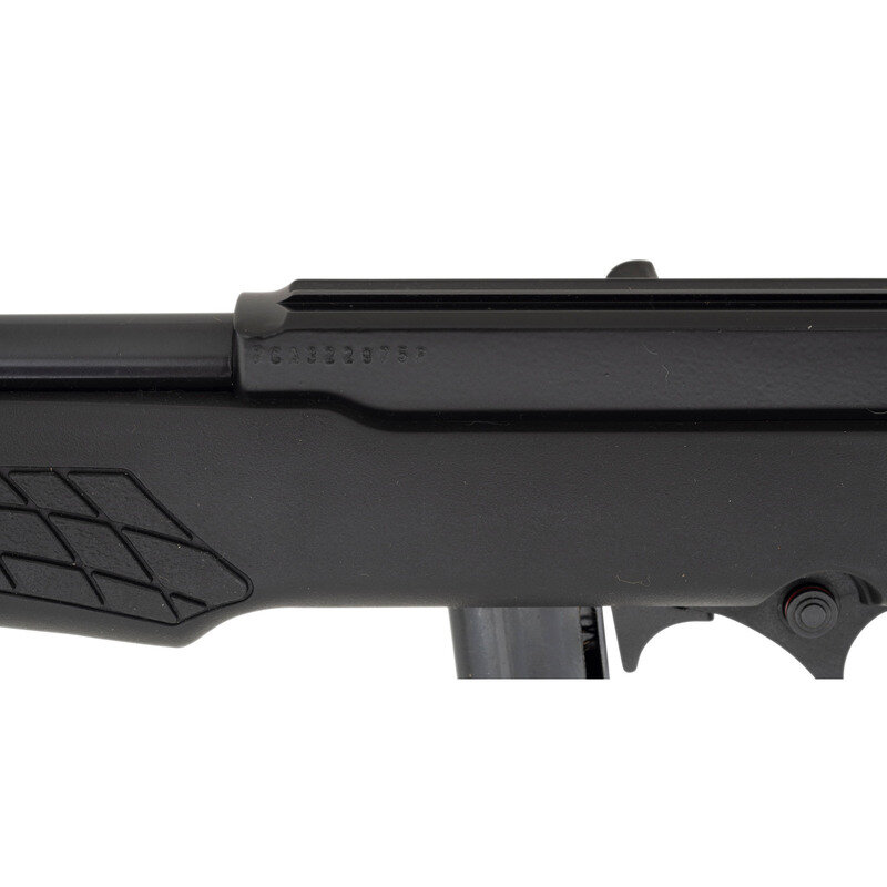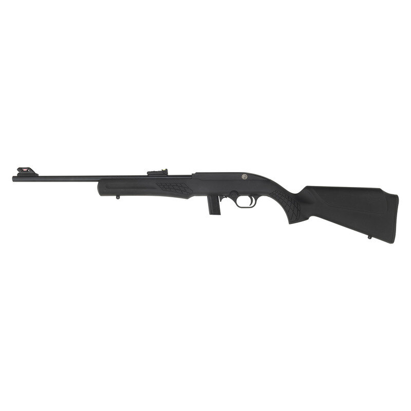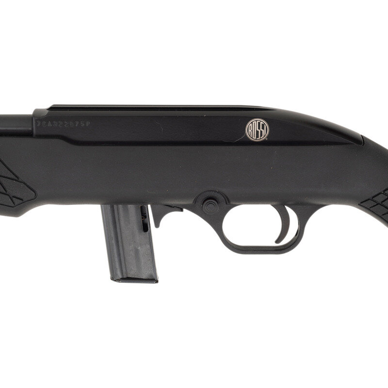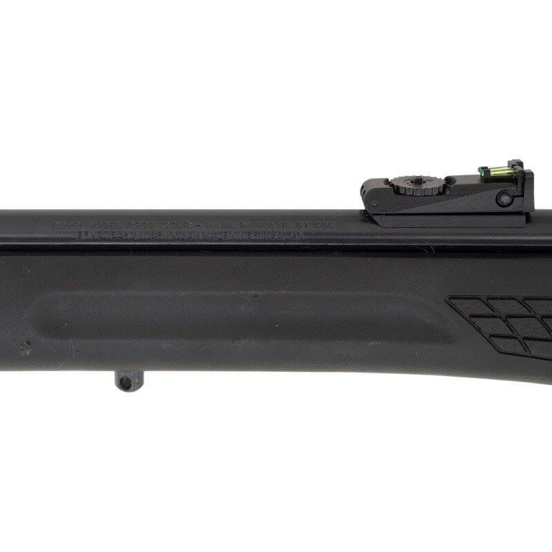 .22 LR. 18" barrel length. SN: 7CA322975P. Blued metal finish with black painted receiver set in a black synthetic Monte-Carlo style stock with front and rear sling swivel studs and optics mounting dovetail to the receiver. Simple blowback operated semi-automatic rifle fed by detachable single stack magazines mounting fiber optic sights consisting of an adjustable rear notch and hooded front sight. Markings include ROSSI MODEL RS22 .22 LR - MADE IN BRAZIL BY CBC/BRAZTECH INTERNATIONAL, BAINBRIDGE, GA. Comes in a ROSSI marked cardboard box with one magazine.