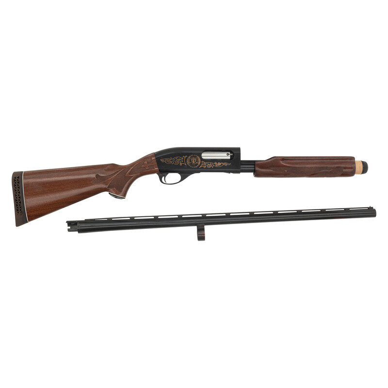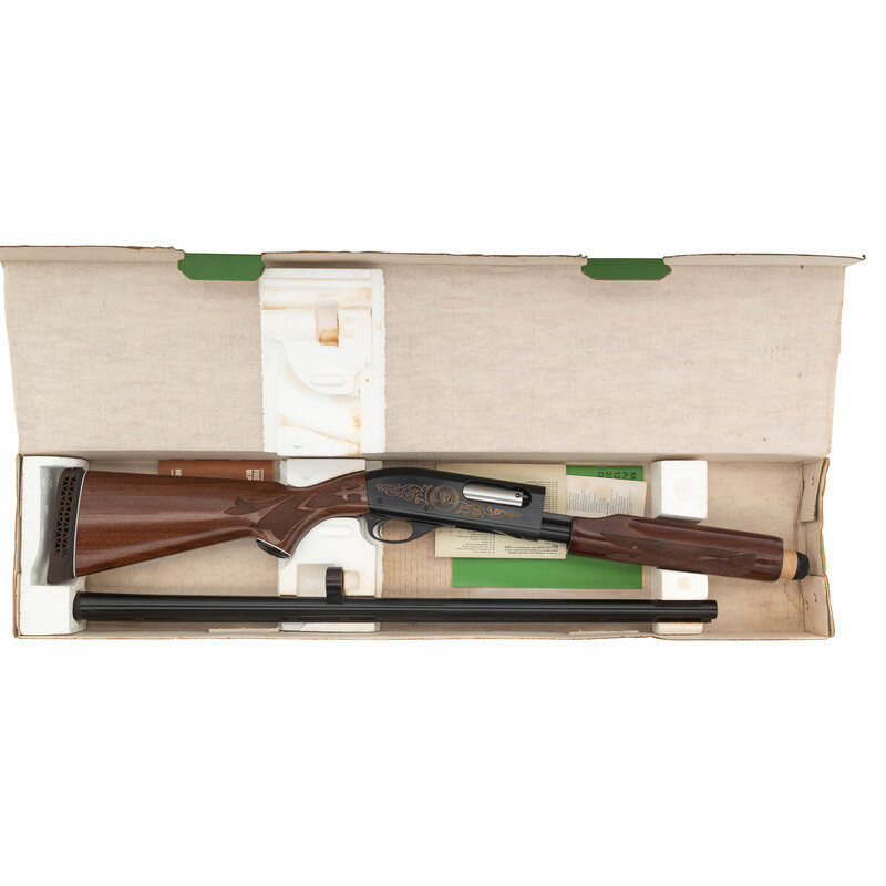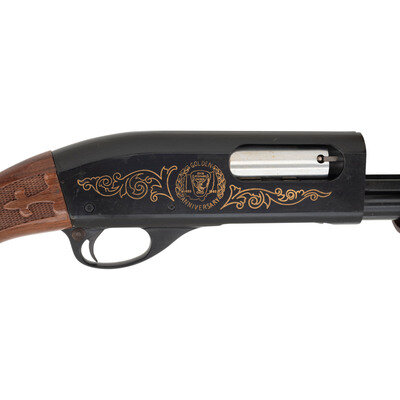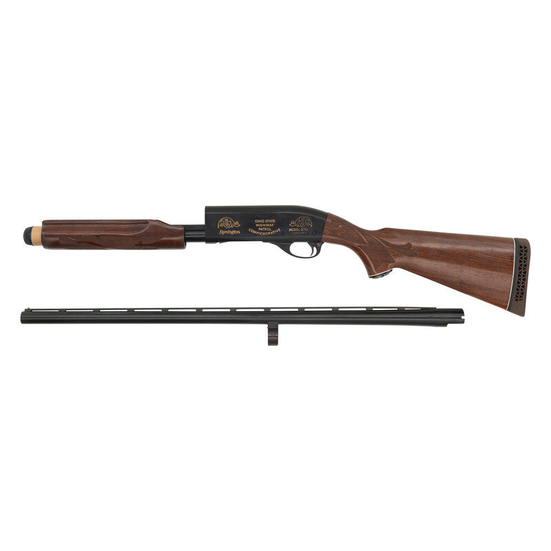 12 gauge. 28" barrel length. SN: V846576V. Blued metal finish with gold accented markings. Two piece walnut stock has fleur-de-lis checkering to semi pistol grip and beavertail forearm. Slide action shotgun with a vented rib, steel bead front sight, tube magazine, and a vented rubber recoil pad. Markings include gold accents designs commemorating the 50th anniversary of the Ohio State Highway Patrol to both sides. Includes original box.