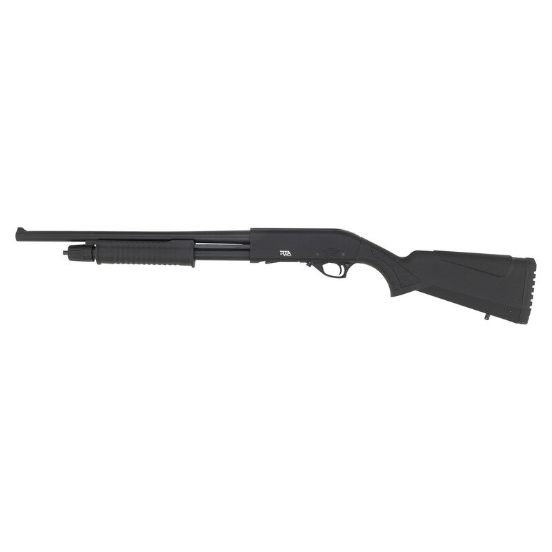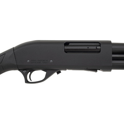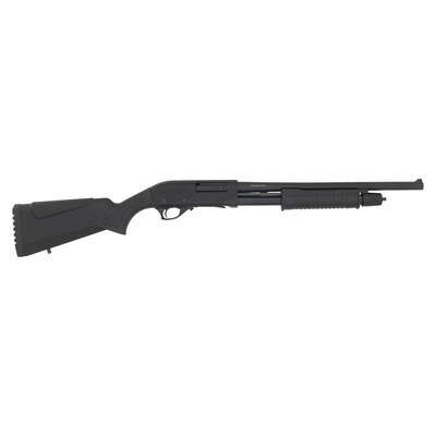 12 gauge. 18.5" barrel length. SN: R377958. Black parkerized metal finish. Black synthetic stock has textured panels and finger grooves to semi pistol grip and forearm. Slide action shotgun with a blade front sight, tube magazine, rubber recoil pad, and cuts to top of receiver. Includes original manufacturer box.