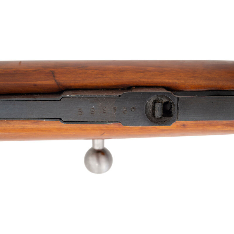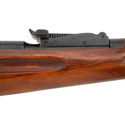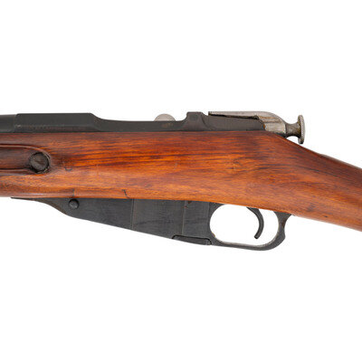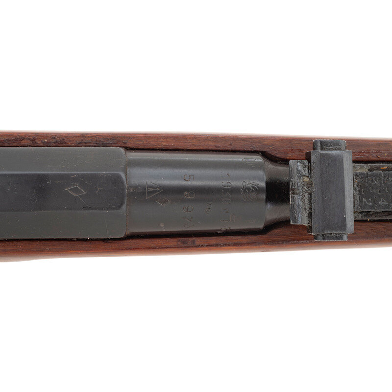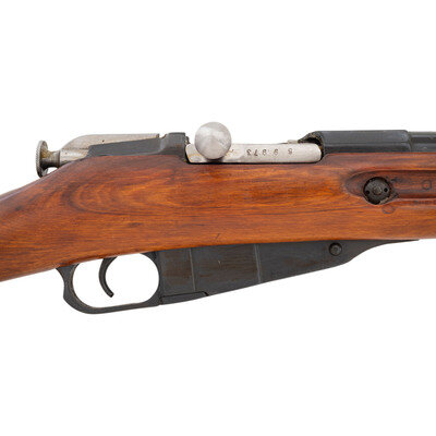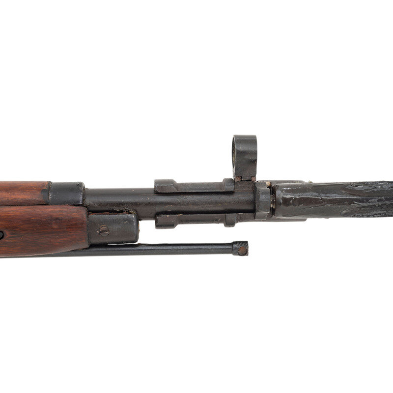 7.92x54mmR. 29.5" barrel length. SN: T123904. Blued military finish with polished steel bolt. Hardwood stock has a plain straight grip and forearm, with handguard and grasping grooves. Bolt action rifle with an adjustable tangent notch rear sight and globe post front sight. Item features an internal box magazine, sling loops, cleaning rod, and double barrel bands. Markings include Izhevsk Arsenal proof, 1930 date, and a diamond mark to receiver indicating a refurbishment. Included with item is surplus dog collar OD sling, Kyrza two-cell pouches, and an M1891/30 socket spike bayonet.