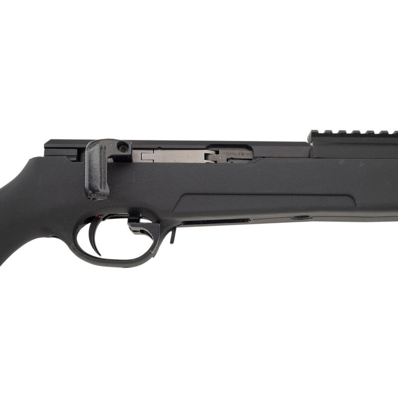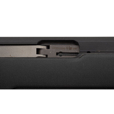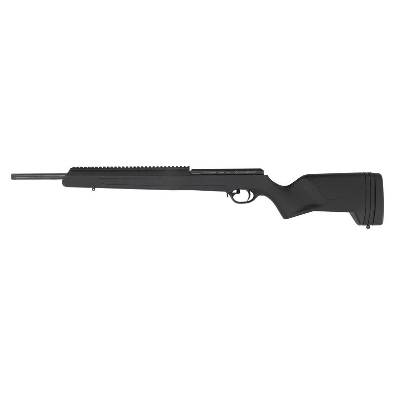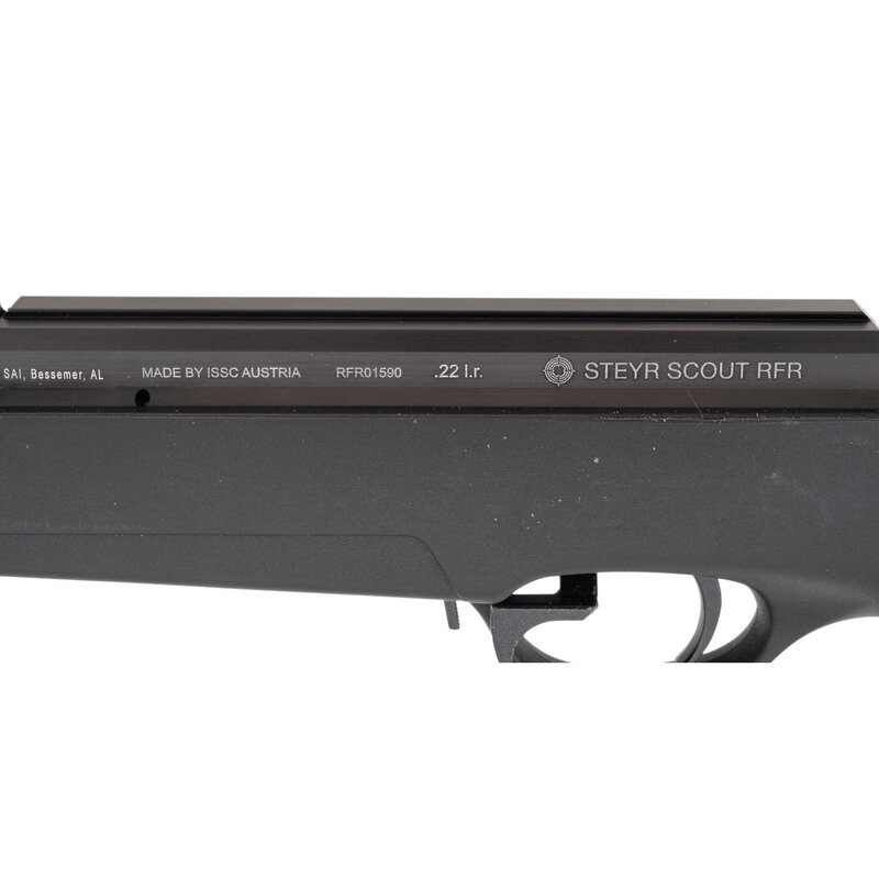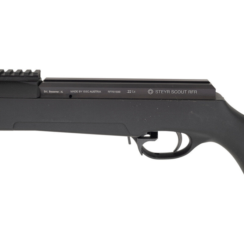 .22 LR. 20" barrel length. SN: RFR01590. Blued metal finish with black Anodized receiver set in a synthetic semi-pistol grip stock featuring a threaded muzzle and butt adjustable for length of pull with inserts. Straight-pull action repeating rifle fed by detachable magazines mounting a dovetail rail for optics mounting to the top of the receiver, and a 12.25" synthetic picatinny rail to the top of the handguard. Left receiver shows importer marking SAI, Bessmer, AL followed by MADE BY ISSC AUSTRIA with model marking STEYR SCOUT RFR. Right barrel and bolt show Austrian firing proofs and matching serial numbers. Comes in a matching Steyr marked black plastic hard case.