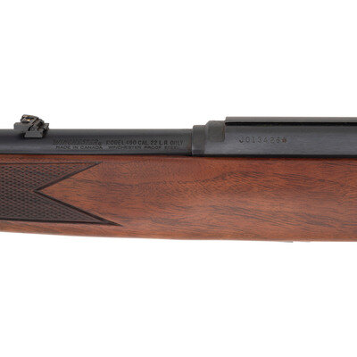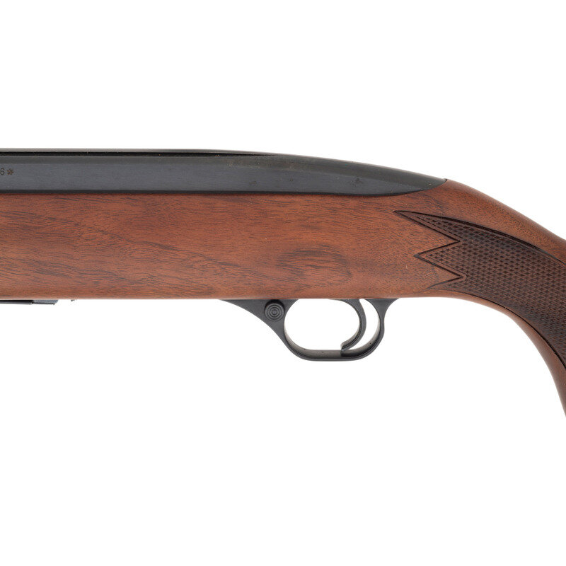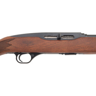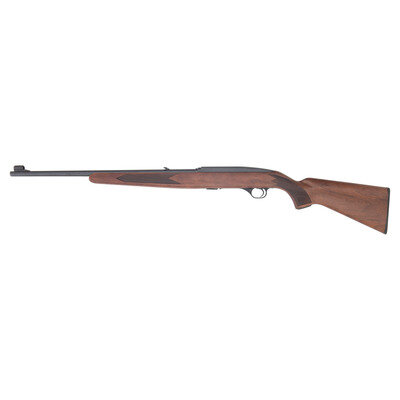 .22 LR. 22" barrel length. SN: J013426*. Blued metal finish. Walnut stock has checkering to semi pistol grip and forearm. Semi automatic rifle with an adjustable folding notch rear sight, hooded blade front sight, and removable magazine. Included is the original manufacturer box with wax paper.