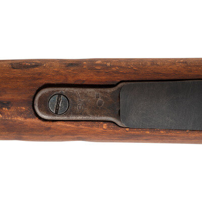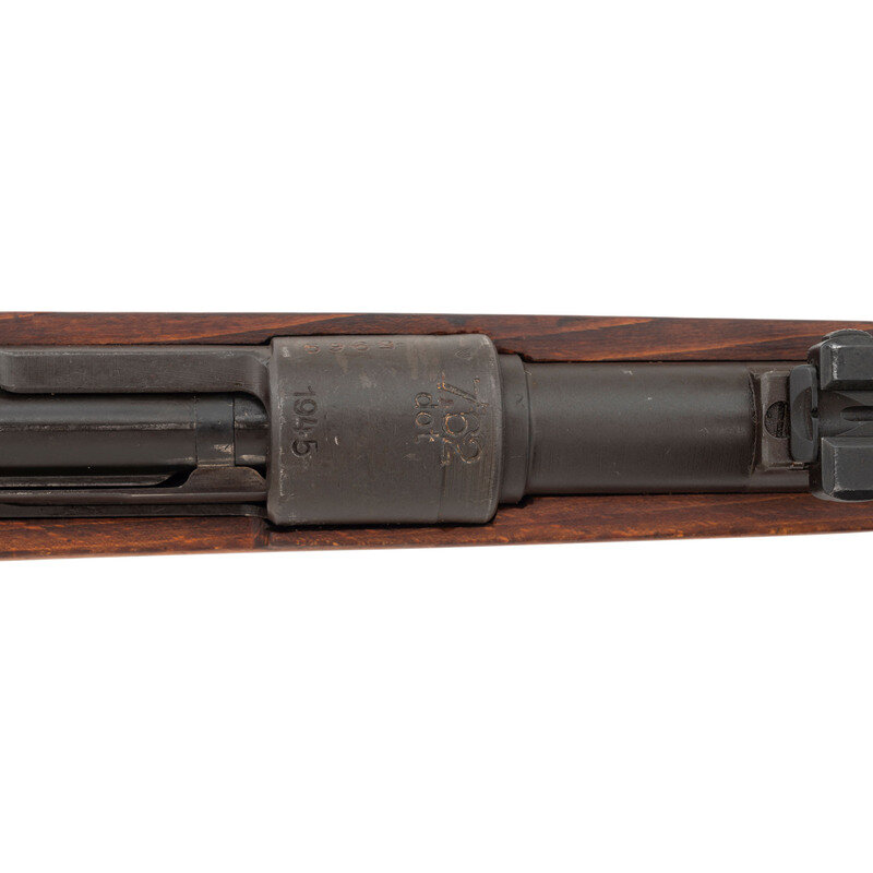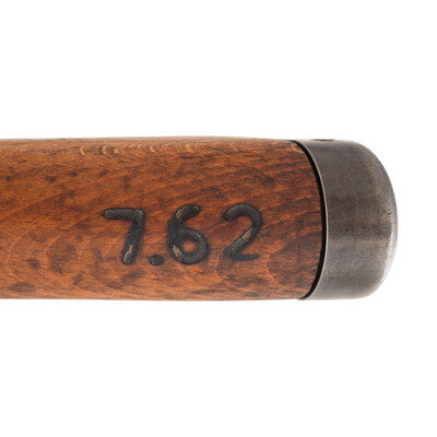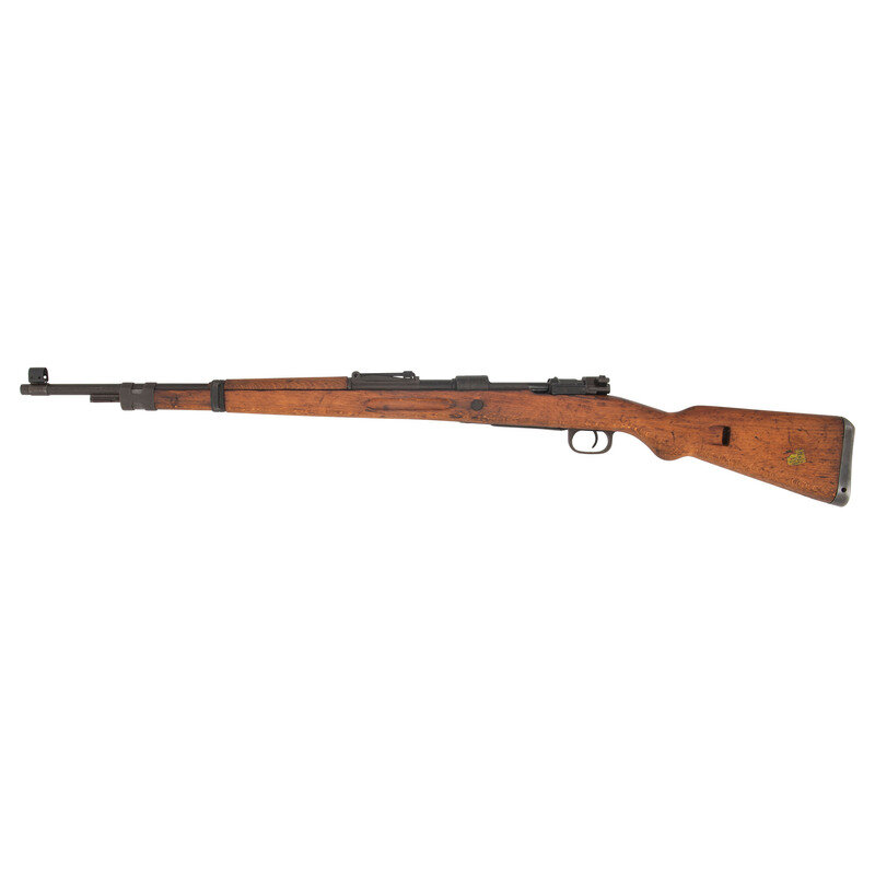 7.62x51mm NATO. 24" barrel length. SN: 5969. Parkerized metal finish. Walnut stock has a plain semi pistol grip and forearm, with handguard and grasping grooves. Bolt action rifle with an adjustable tangent notch rear sight and hooded blade front sight. Item features an internal magazine, double sling loops, bayonet lug forend, and cupped steel buttplate. Markings include 7.62 Israeli arsenal markings to receiver and bottom edge of stock, a 1945 date to receiver, and various Israeli and German proofs to parts and stock. Left side of stock has a partial sticker with Hebrew text and a 1976 date.