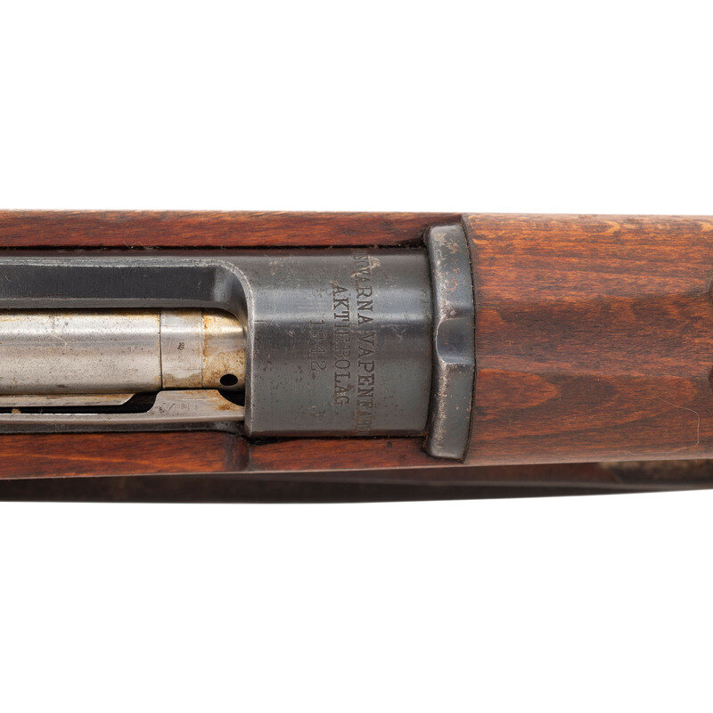 6.5x55mm Swedish. 24" barrel length. SN: 646983. Blued metal finish and polished steel bolt. Walnut stock has a plain straight grip and forearm, with handguard and grasping grooves. Bolt action rifle with an adjustable tangent notch rear sight and blade front sight. Item features an internal magazine, bayonet lug forend, double sling swivels, and a slotted head cleaning rod. Markings include Husqvarna manufacturer marks and a 1942 date to receiver, matching serial numbers to parts, and importer marks to bottom of barrel. Includes a brown leather sling.
