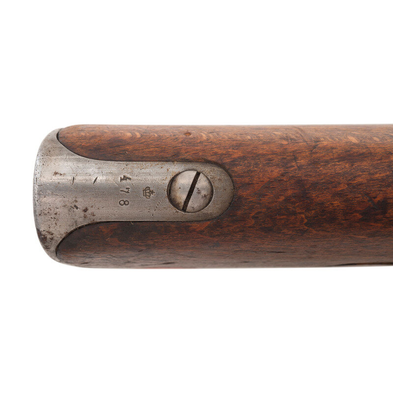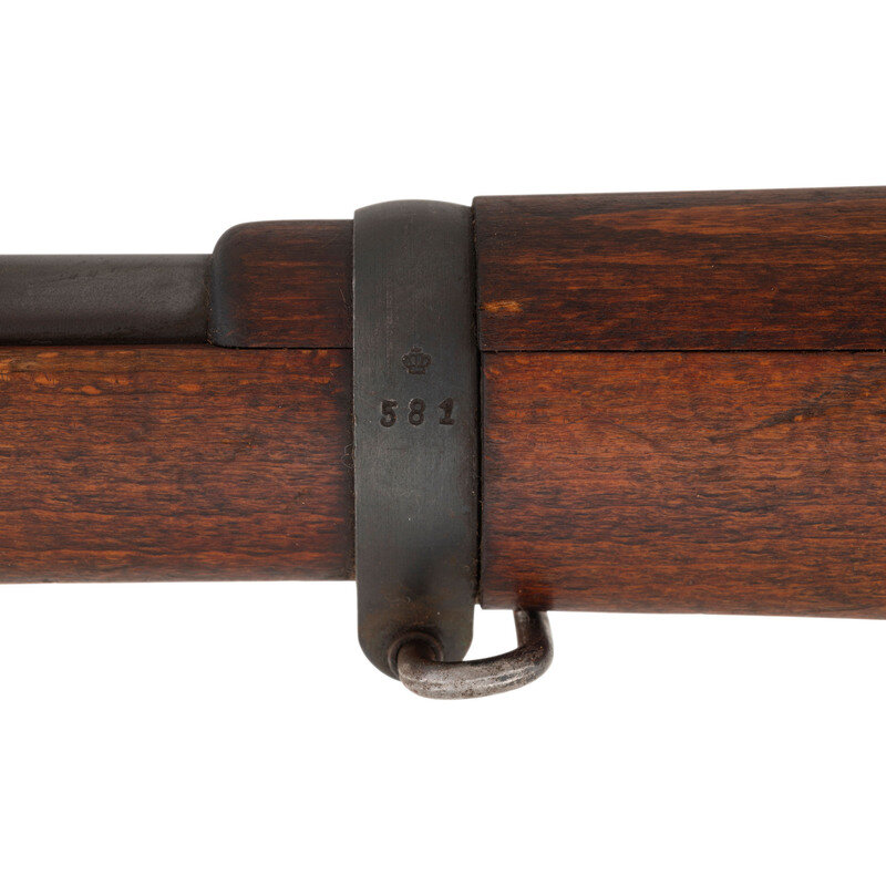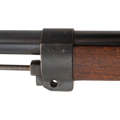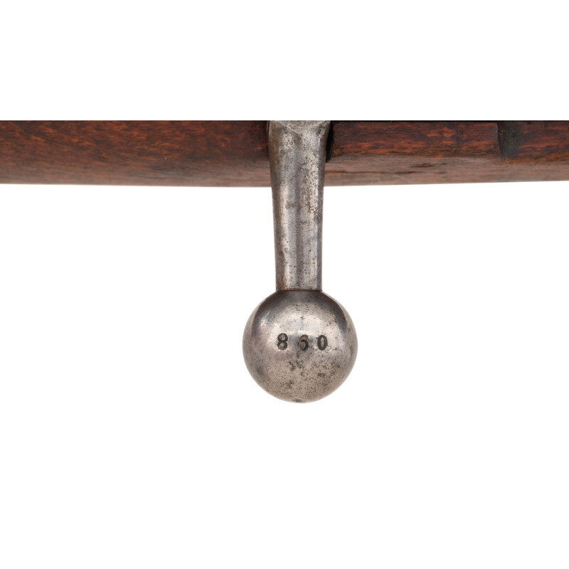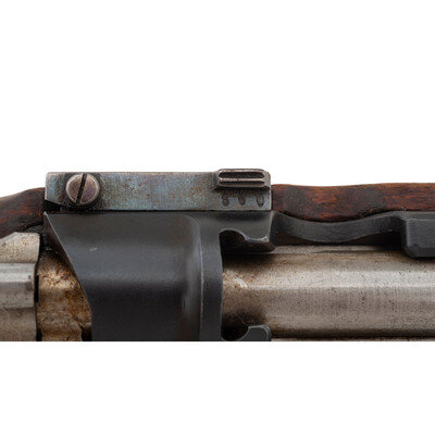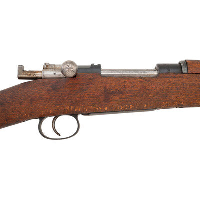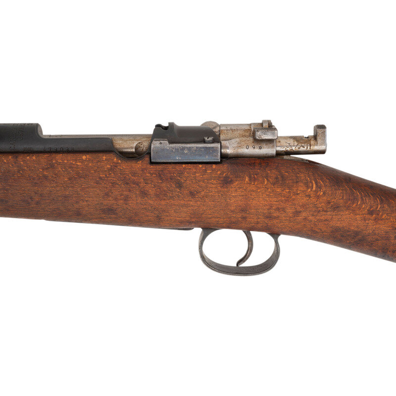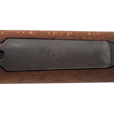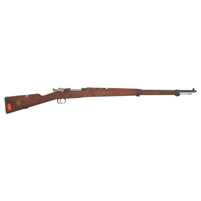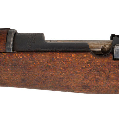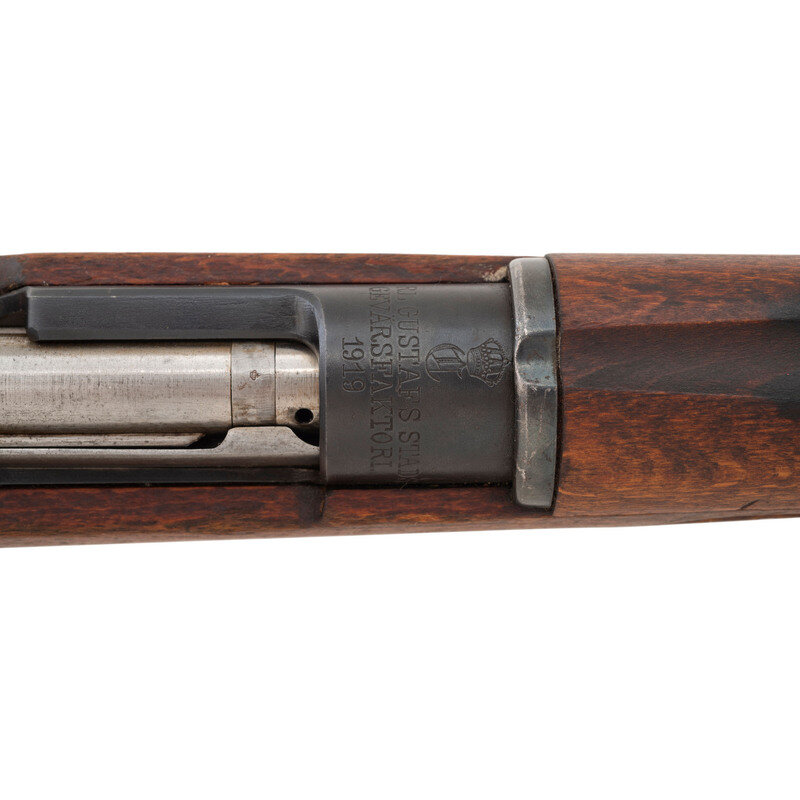 6.5x55mm Swiss. 29" barrel length. SN: HK479098. Blued metal finish to barrel, with polished steel bolt. Walnut stock has a plain straight grip and forearm, with handguard and grasping grooves. Bolt action rifle with an adjustable tangent notch rear sight and blade front sight. Item features an internal box magazine, double sling swivels, threaded muzzle, and slotted head cleaning rod. Serial numbers are non-matching. Receiver shows Carl Gustafs manufacturer marks and a 1919 date.