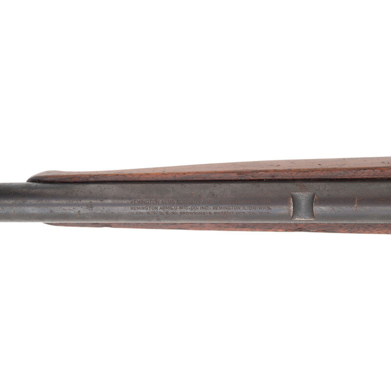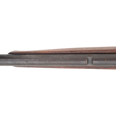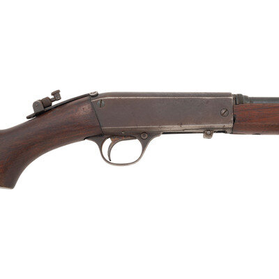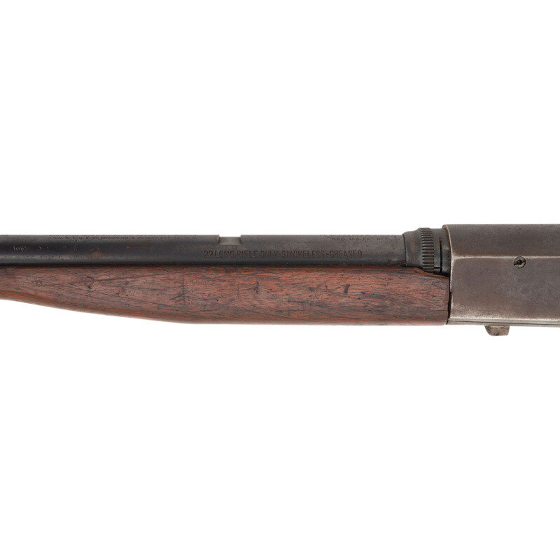 .22 LR. 19" barrel length. SN: 82245. Blued metal finish. Two piece walnut stock has a plain semi pistol grip and forearm, with Schnabel forend. Semi automatic rifle with a Marbles folding adjustable tang mounted peep sight, blade front sight, tube magazine in butt, and bottom ejector.