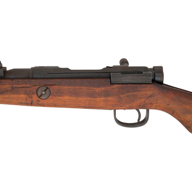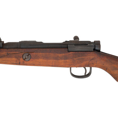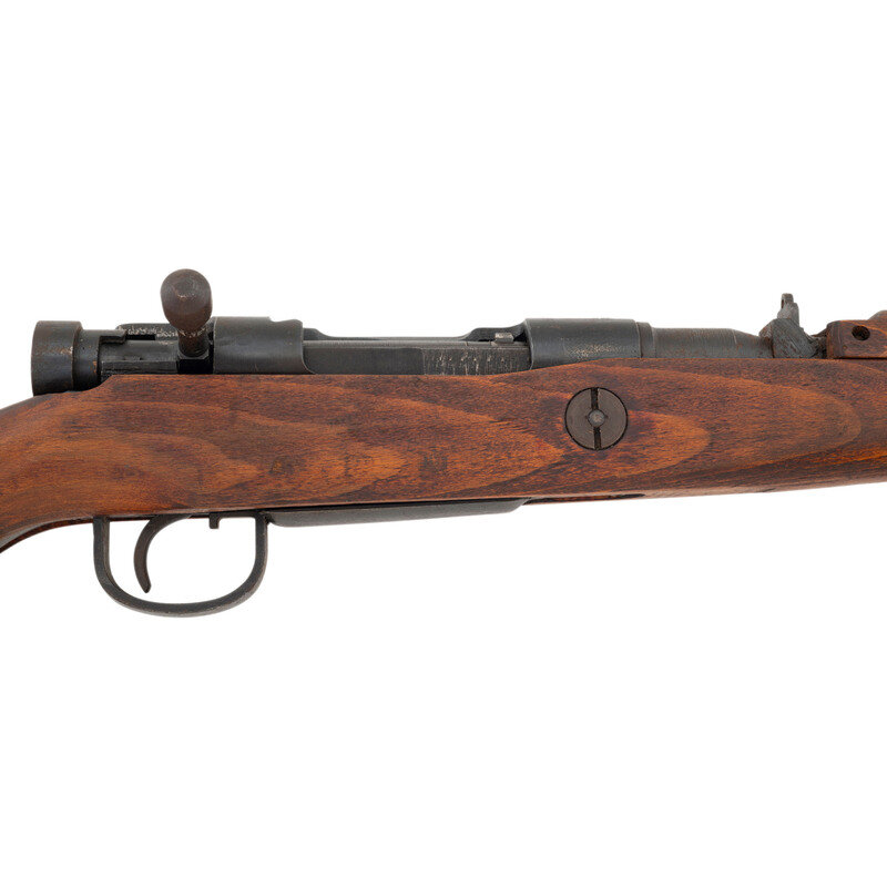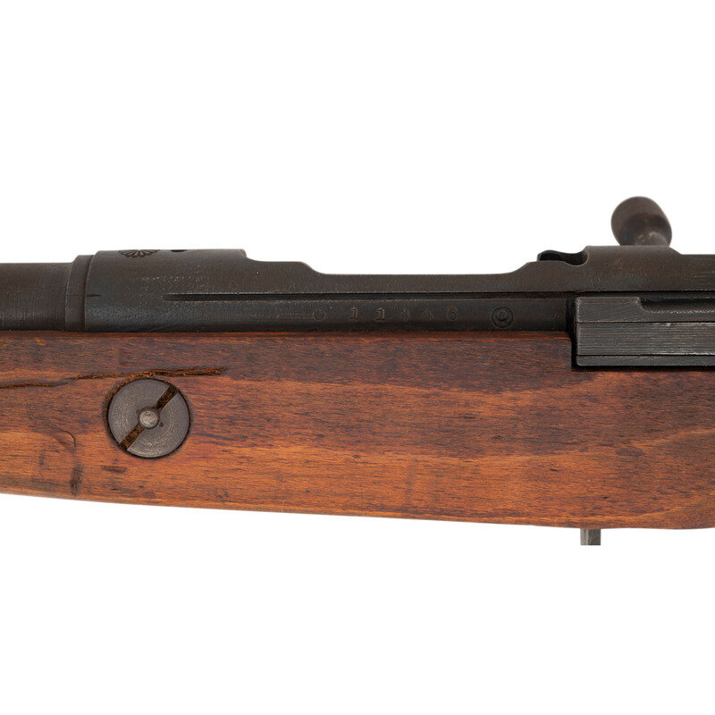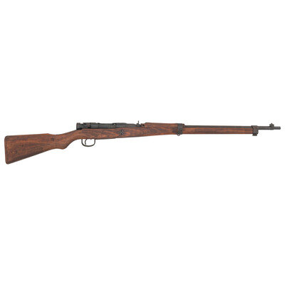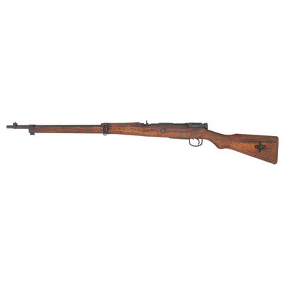 7.7x58mm Arisaka. 26" barrel length. SN: 11446. Blued military finish. Hardwood stock has a plain semi pistol grip and forearm, with handguard and grasping grooves. Bolt action rifle with a peep rear sight and blade front sight. Item features an internal magazine, double side sling loops, bayonet lug forend, and a wood buttplate. Markings include a full mum to receiver and