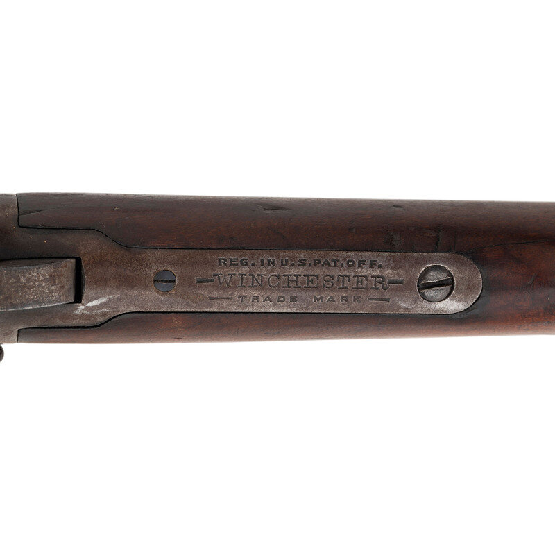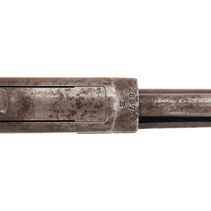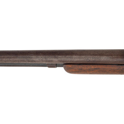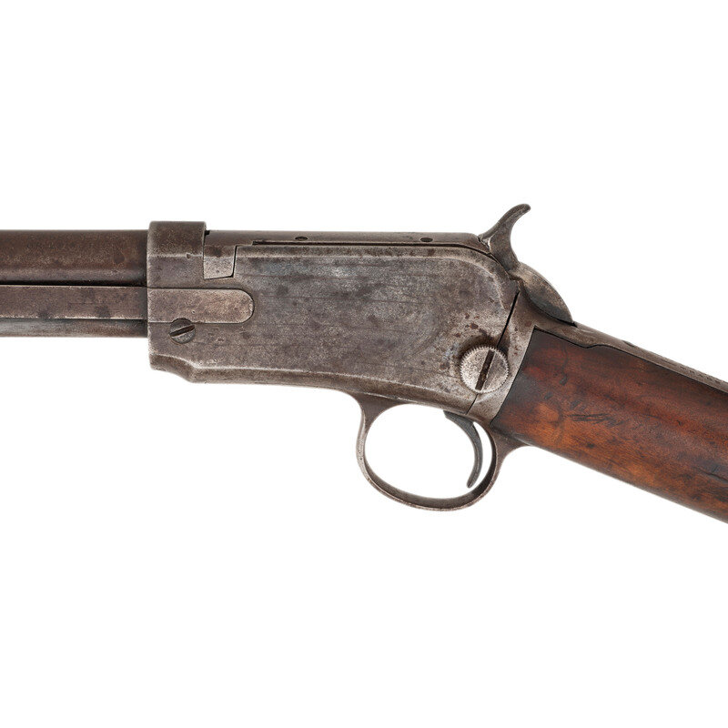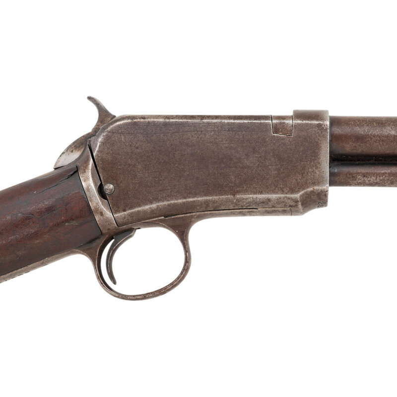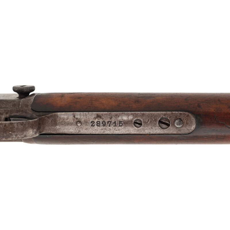 .22 S/L/LR. 20"barrel length. SN: 289715. Blued metal finish. Two piece walnut stock has a plain straight grip and non-grooved forearm. Slide action rifle with an adjustable notch rear sight, blade front sight, tube magazine, and takedown knob.
