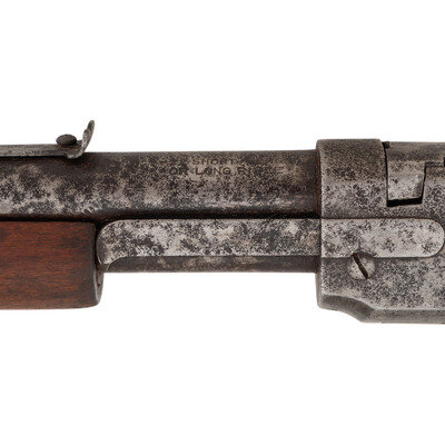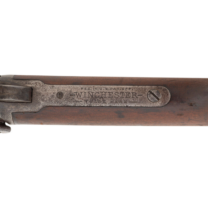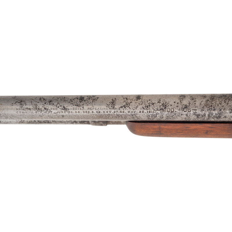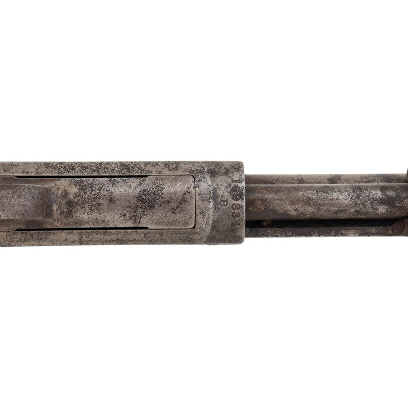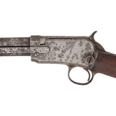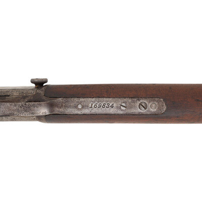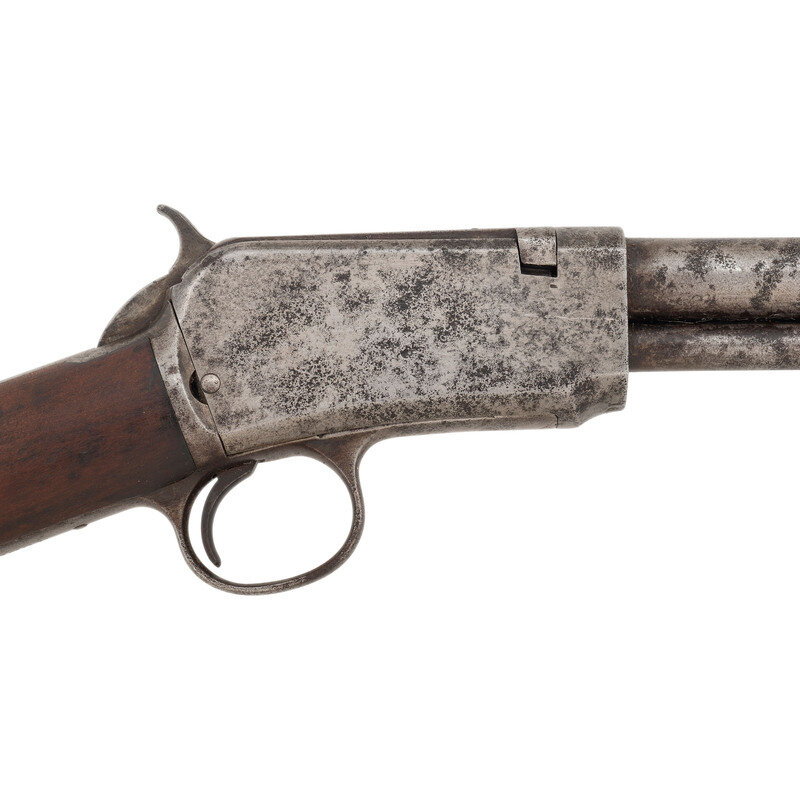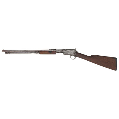 .22 S/L/LR. 20" barrel length. SN: 169834. Blued metal finish that has worn away. Two piece walnut stock has a plain straight grip and non-grooved forearm. Slide action rifle with an adjustable notch rear sight, blade front sight, tube magazine, and takedown knob.