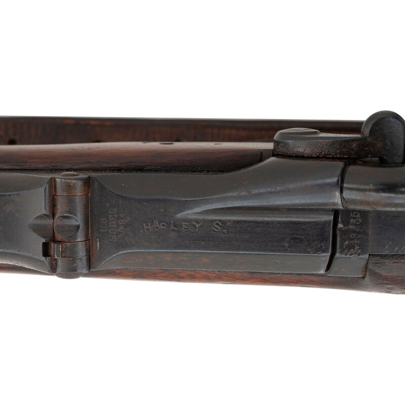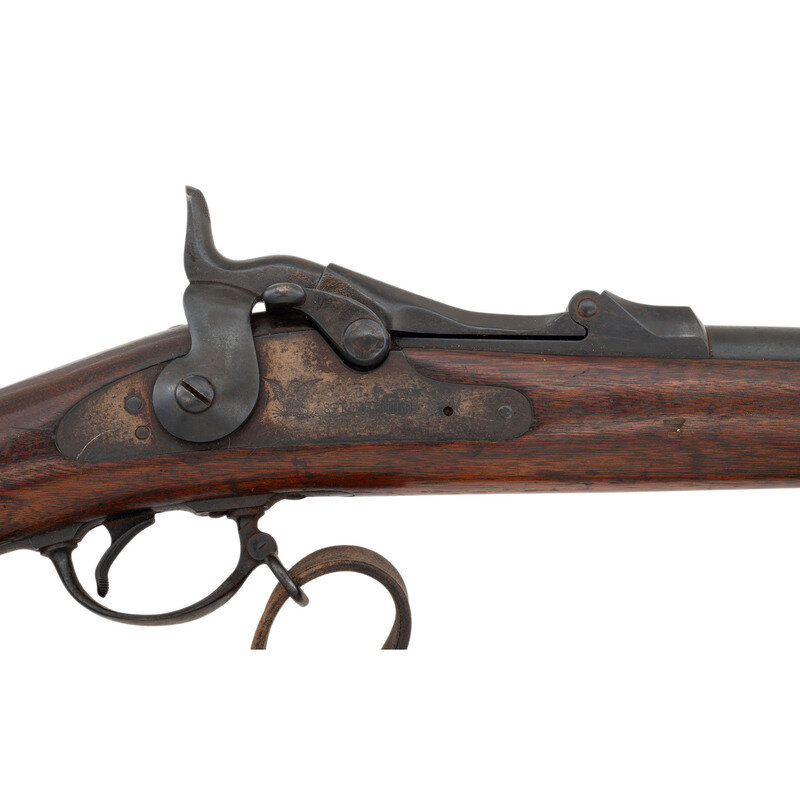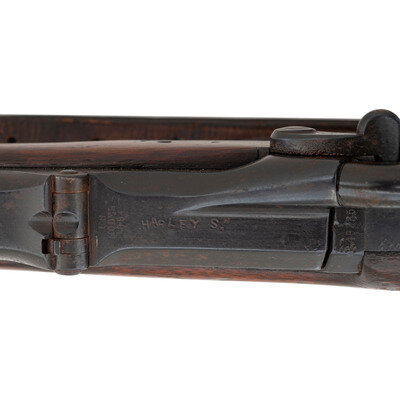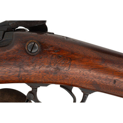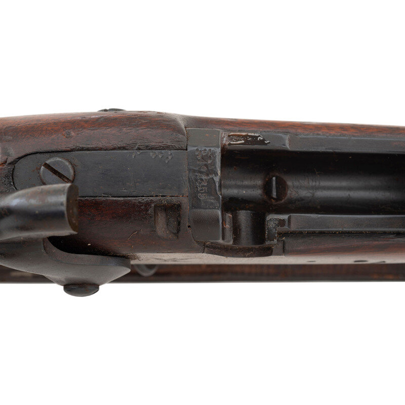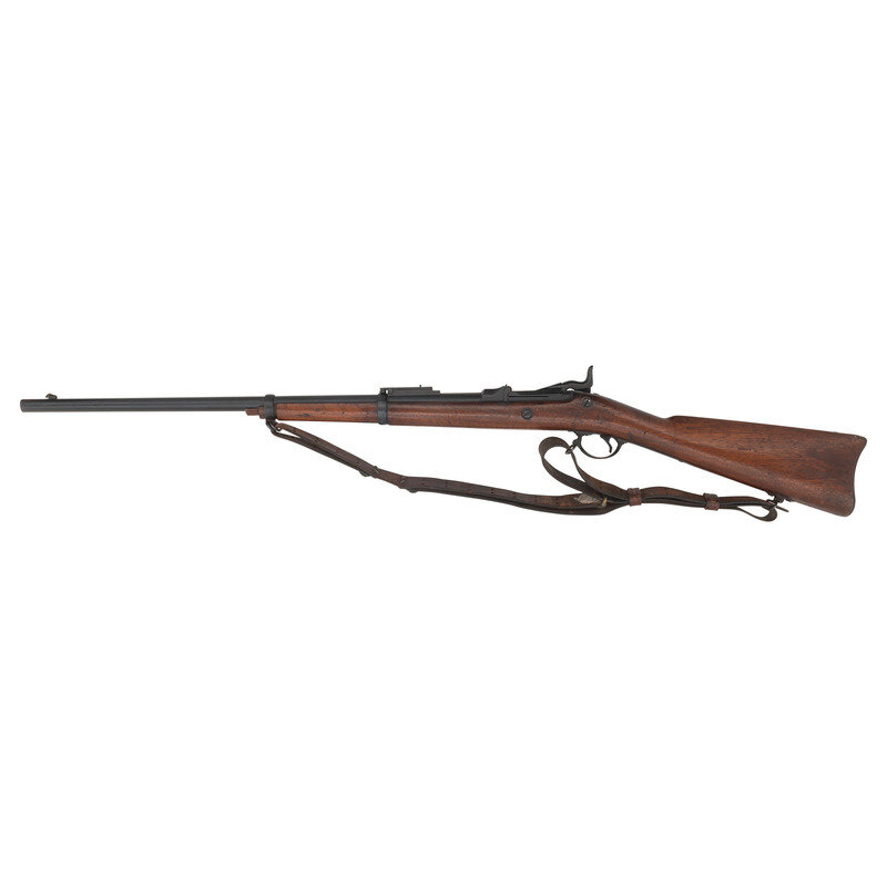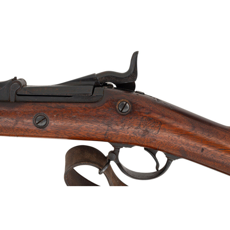 45-70. 26.5" barrel. SN: 482335 (mfg. ca1890). Modern blued finish, shortened walnut stock. Single shot breechloading metallic cartridge military rifle altered for civilian use by shortening the barrel and stock, with 1884 pattern Buffington adjustable ladder rear sight, replaced front sight blade and sling and stacking swivels. Lock marked U.S./SPRINGFIELD with a {Spread Winged Eagle} and breechblock marked U.S./MODEL/1884. Counterpane with weak SWP (Samuel W Porter) cartouche that appears to be dated 1890 and a weak {Circle-P} firing proof is present behind the triggerguard. Breech with V/P/{Eagle Head} inspection marks as well as an additional small P mark. Rifle features a low arch breech with bronze firing pin, three-click tumbler, grooved trigger with checkered tip, two-piece triggerguard and solid buttplate without trap door. Stock shortened to "two band rifle" configuration. No cleaning rod is present. A well worn US 1905 pattern leather sling is attached to the rifle.