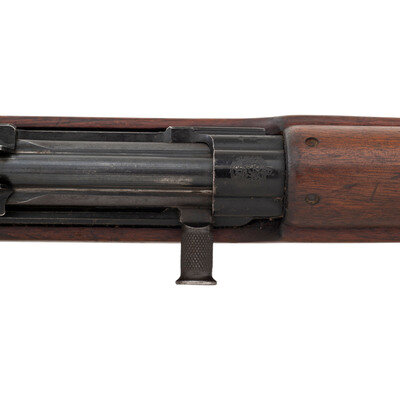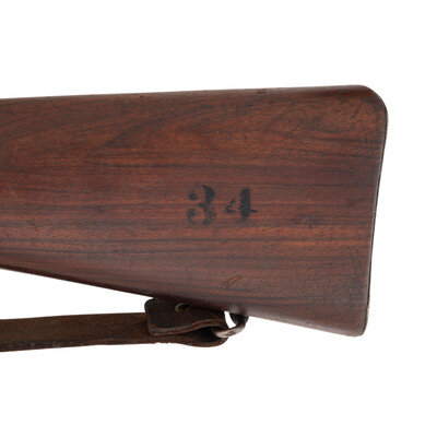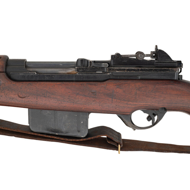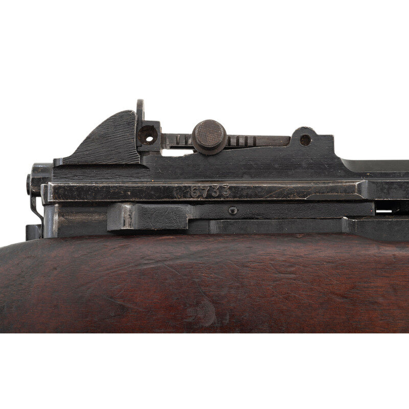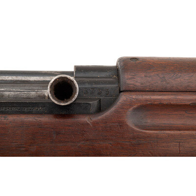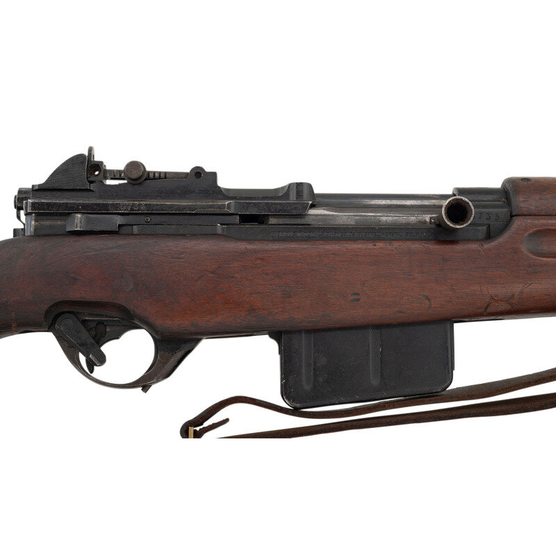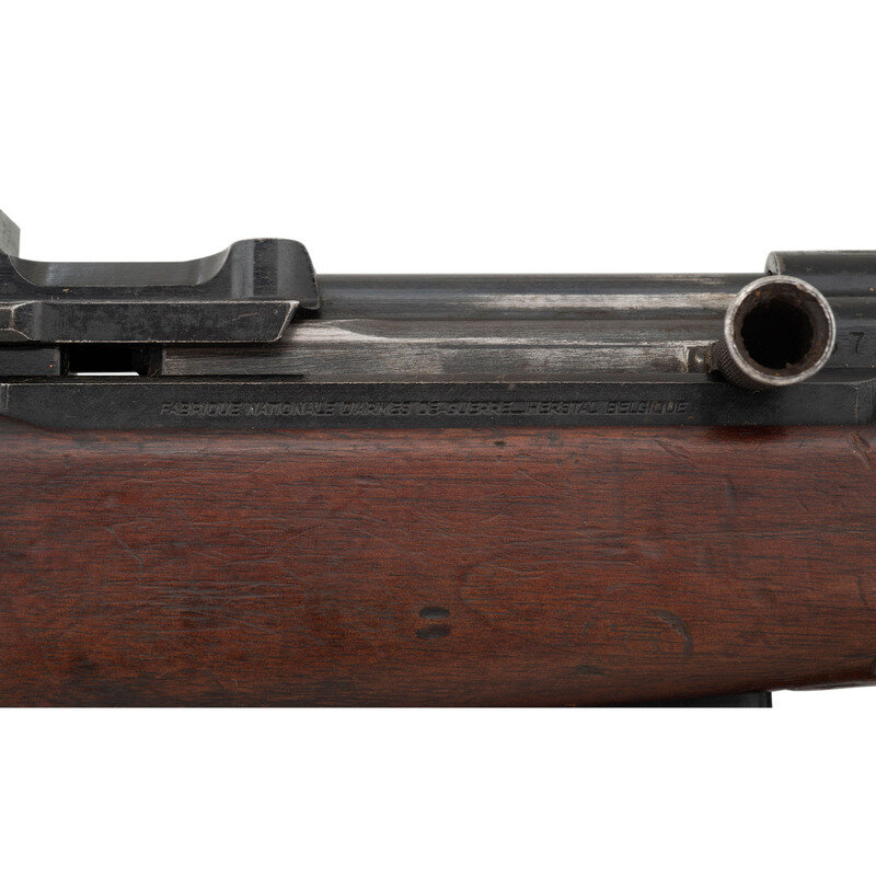 7x57mm Mauser. 24" barrel with muzzle brake. SN: 6733. Black/blued metal finish. Walnut stock has a plain semi pistol grip and forearm, with handguard and grasping grooves. Gas operated semi automatic rifle with an adjustable tangent peep rear sight and blade front sight with ear protectors. Item features a fixed 10-round magazine, bayonet lug forend, muzzle brake, double sling swivels, and a brown leather sling. Markings include FN manufacturer marks to metal parts. Stock is marked with a Venezuelan seal to left side of butt and a 34 rack number to right side of butt.