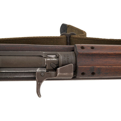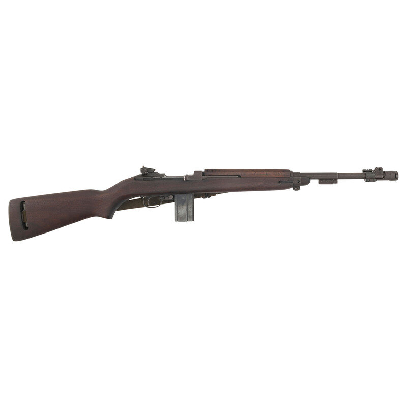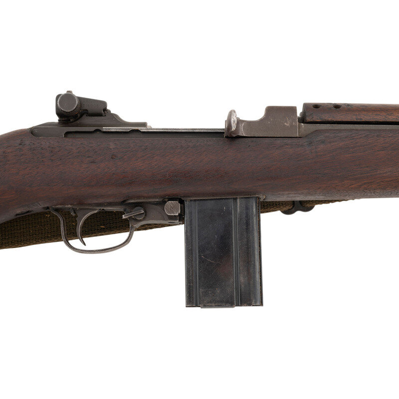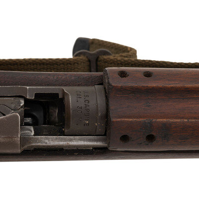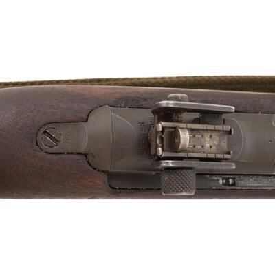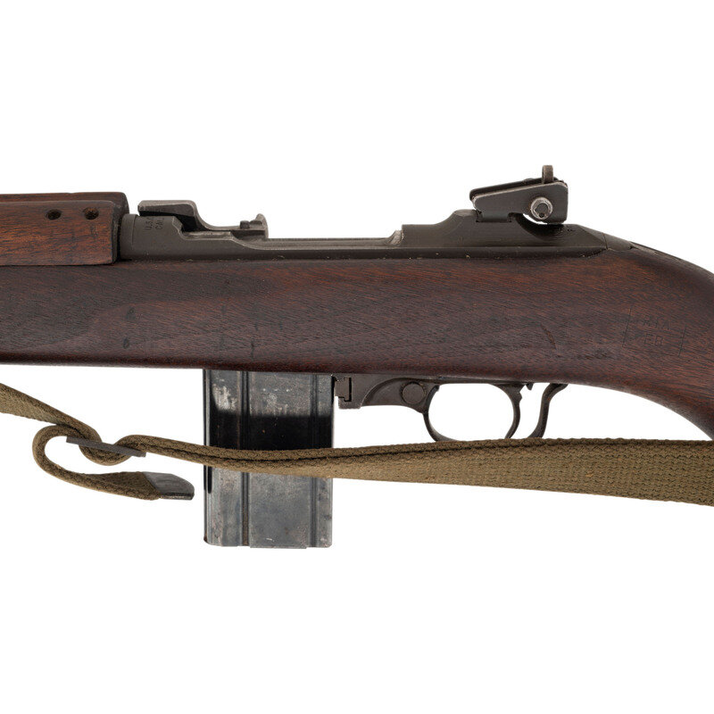 .30 carbine. 18" barrel length. SN: 864658. Grey/green parkerized metal finish. Walnut stock has a plain semi pistol grip and forearm, with four rivet handguard, high wood, and oval cutaway. Semi automatic rifle with type III adjustable peep rear sight, blade front sight with ear protectors, and a recoil check muzzle attachment. Item features a type III bayonet lug barrel band, rotary safety, M-marked magazine push release, and flat top bolt. Markings include INLAND DIV./864658 to rear of receiver, U.S. CARBINE/CAL.30 M1 to front of receiver, and INLAND MFG. DIV./GENERAL MOTORS/8-43 to top of barrel. Stock is marked with a boxed RIA/EB Rock Island Arsenal rebuild cartouche inspected by Elmer M. Bjerke. Includes an OD sling and stock oiler.
