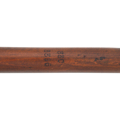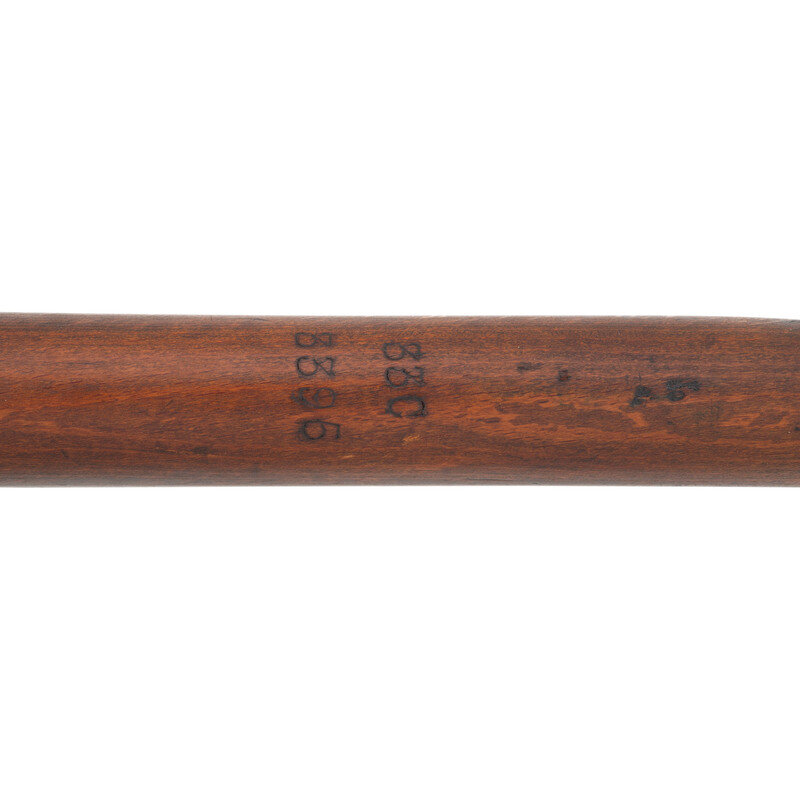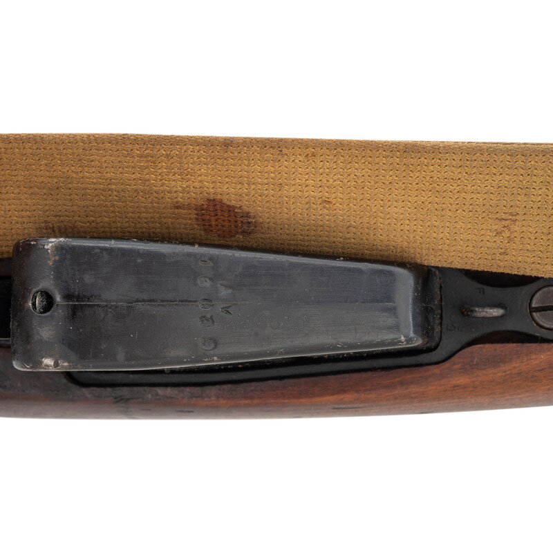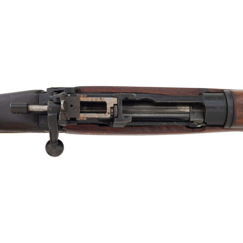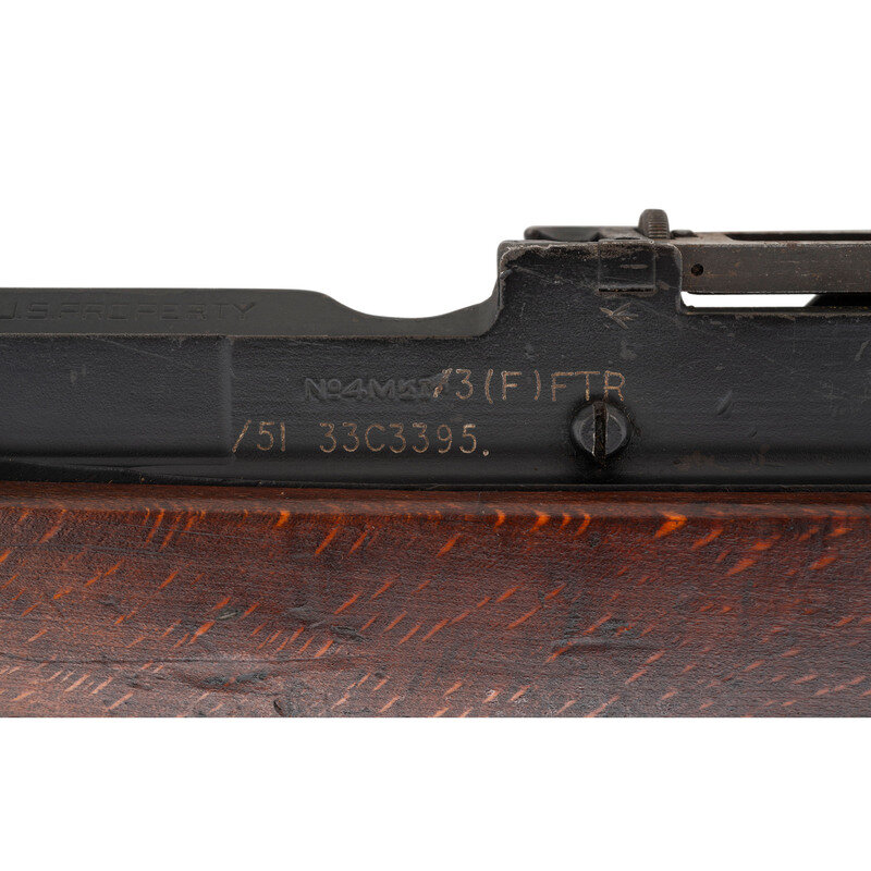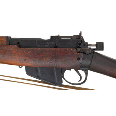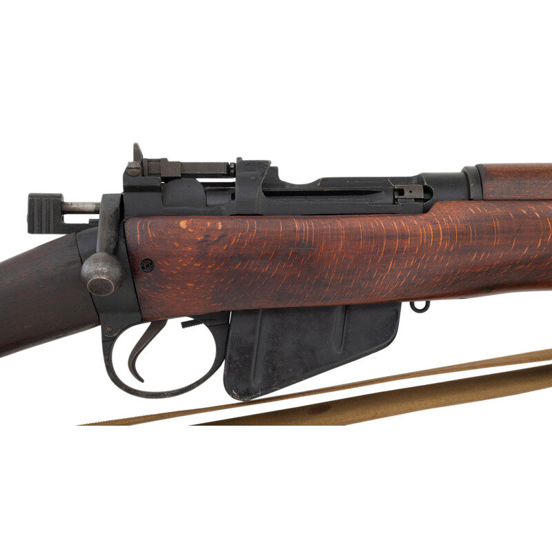 .303 British. 25" barrel length. SN: 33C3395. Black suncorite finish. Walnut stock has a plain semi pistol grip and forearm, with hanguard. Bolt action rifle with an adjustable folding peep rear sight and blade front sight with ear protectors. Item features a removable magazine, bayonet lug, double sling swivels, and a brass trapdoor buttplate with Bakelite oiler. Markings include U.S. PROPERTY marks and various British proofs to parts and stock. Includes an unmarked khaki web sling.