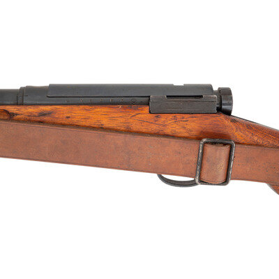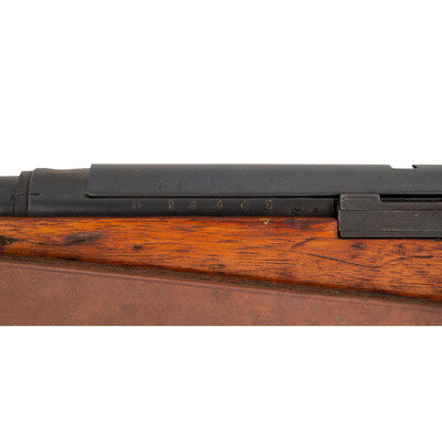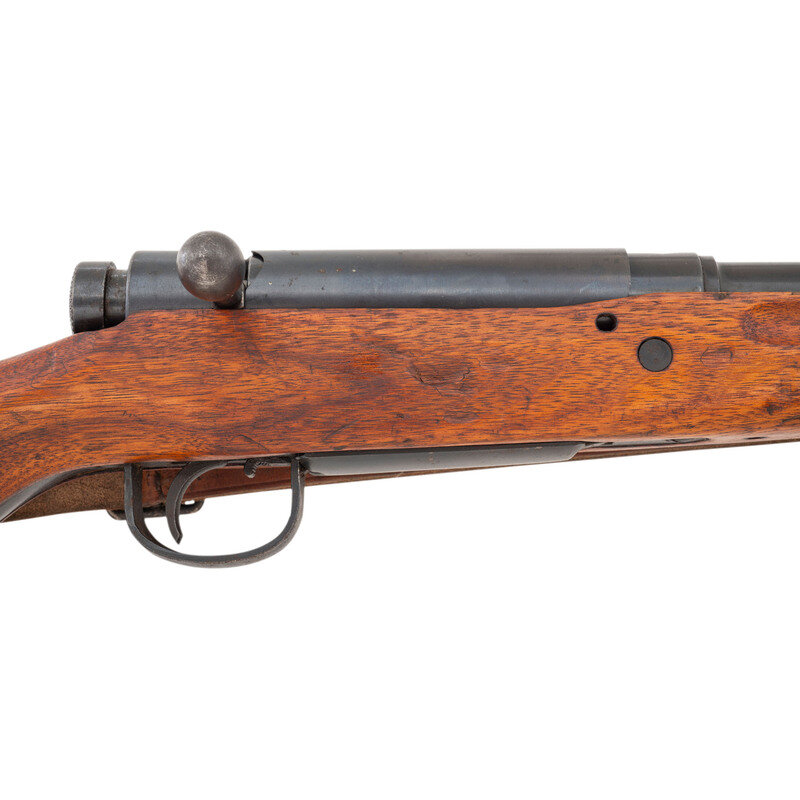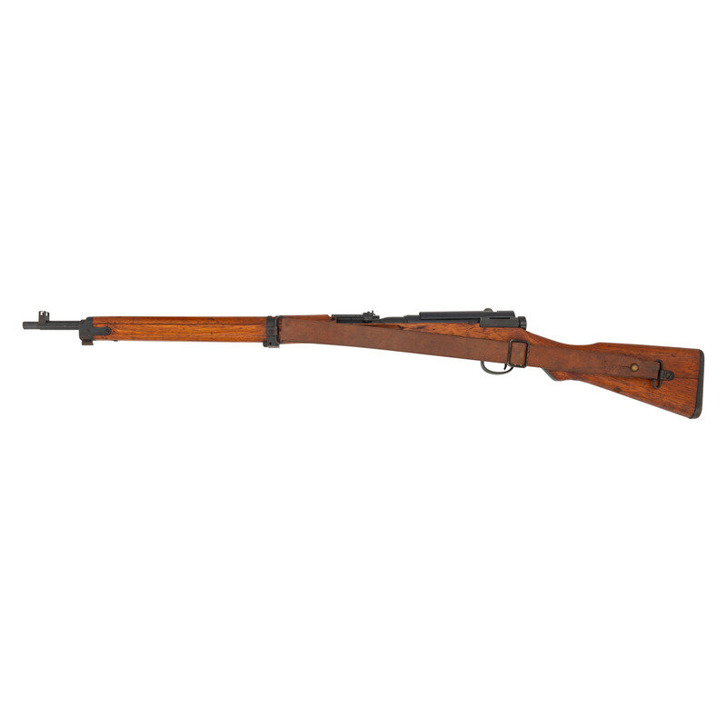 7.7x58mm Arisaka. 26" barrel length. SN: 16367. Blued military finish. Hardwood stock has a plain semi pistol grip and forearm, with handguard and grasping grooves. Bolt action rifle with adjustable folding ladder peep rear sight, anti-aircraft arms, and a blade front sight with ear protectors. Item features an internal magazine, side mounted sling swivels, dust cover, and a bayonet lug forend. Mum has been ground. Includes a brown leather sling. Missing cleaning rod.