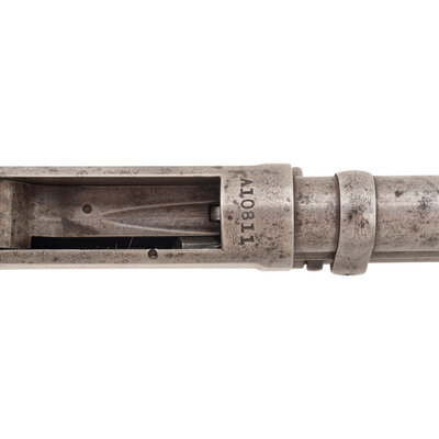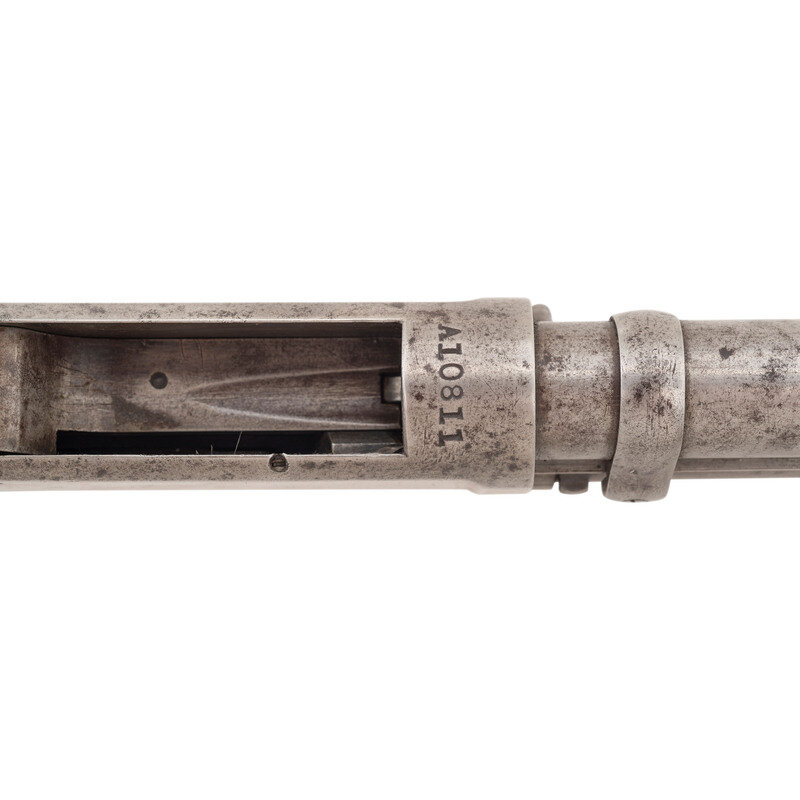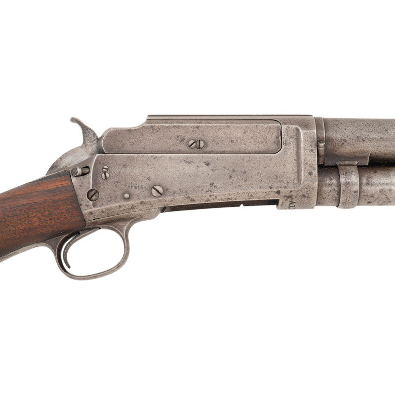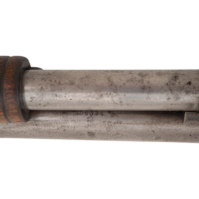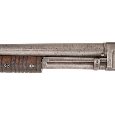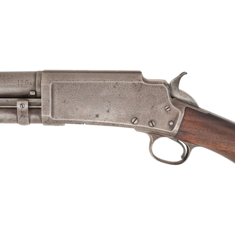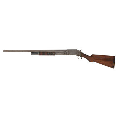 12 gauge. 28" barrel length. Full choke. SN: A10811. Bare finish, blued at some point. Two piece walnut stock has a semi pistol grip and grooved forearm. Slide action shotgun with a steel bead front sight, tube magazine, and a vented rubber recoil pad.