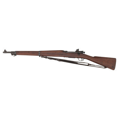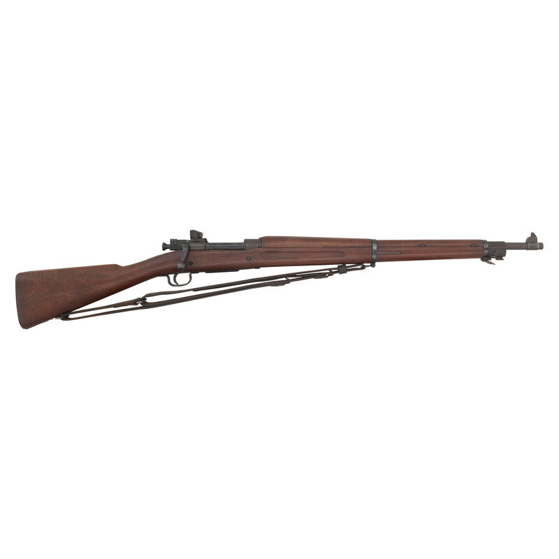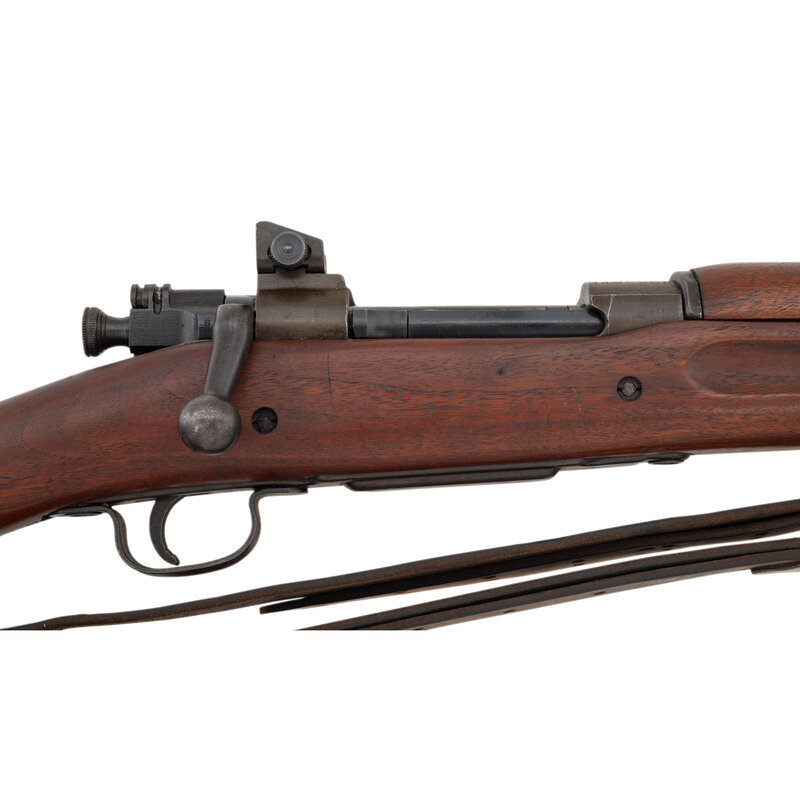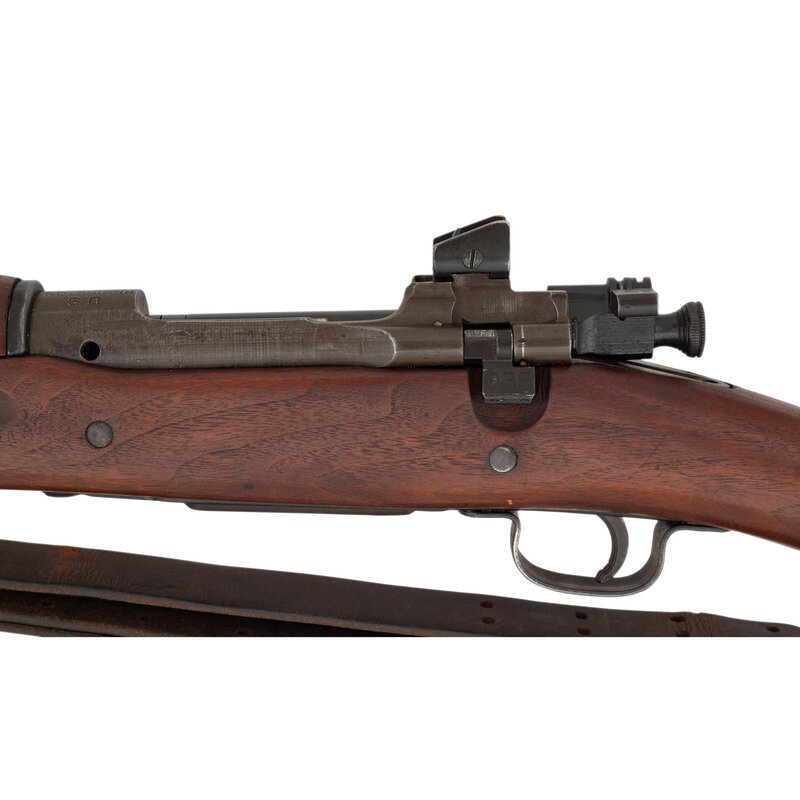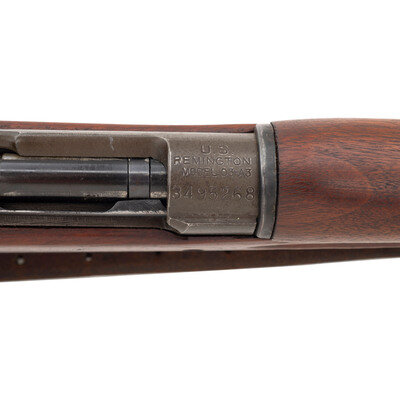 .30-06. 24" barrel. SN: 3495268. Parkerized finish, some blued small parts, straight gripped smooth two-bolt stock with grasping grooves. Bolt action fixed magazine battle rifle with adjustable rear sight, fixed front sight blade, sling and stacking swivels and bayonet lug. Standard Remington markings on receiver, barrel marked RA and dated 03-43. R marked bolt, RI marked stock tip. No markings or cartouches in wood. Includes a leather 1905 pattern sling.