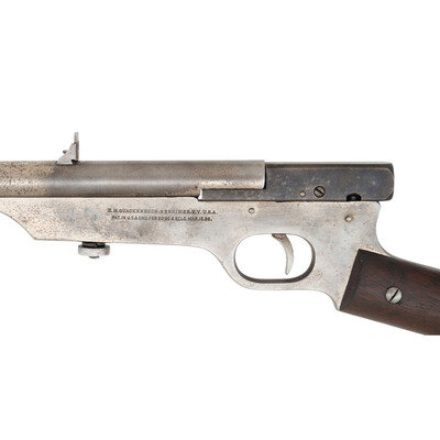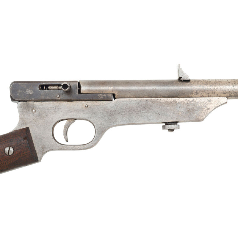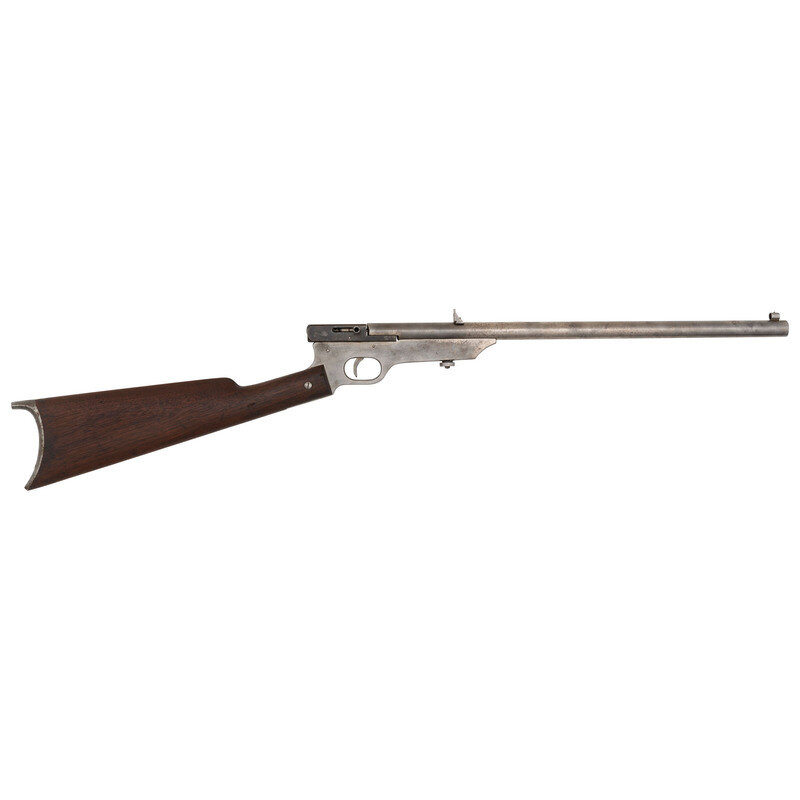 .22 RF. 18" barrel length. SN: NSN. Nickel finish. Walnut stock has a plain straight grip and crescent butt. Single shot swivel breechloading action rifle with a two leaf notch and peep rear sight, as well as octagonal globe post front sight.