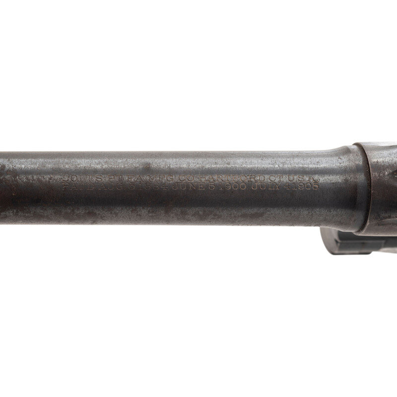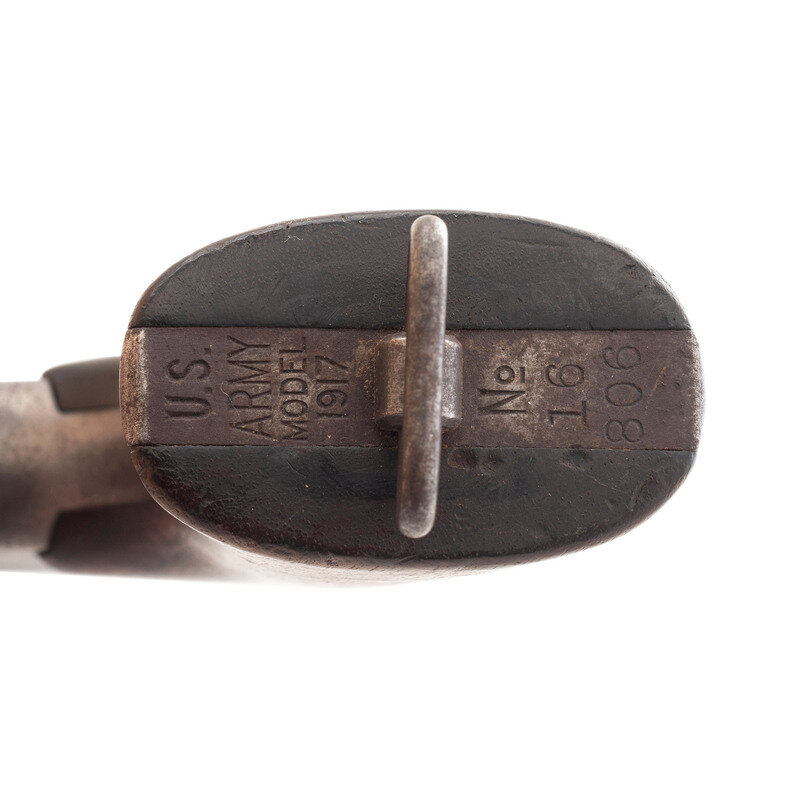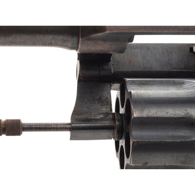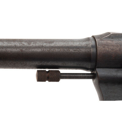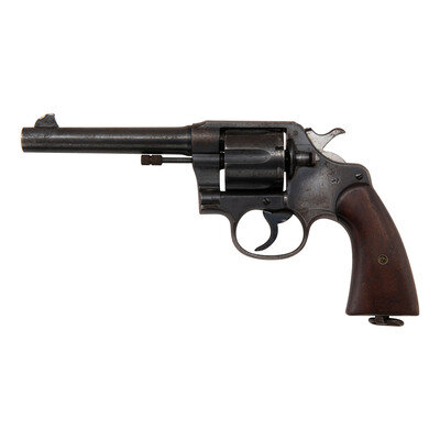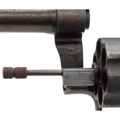 .45 ACP. 5.5" barrel. SN: 16806. Blued finish, smooth walnut grips. Double action revolver with fixed frame notch rear sight, blade front sight, swivel lanyard ring in butt and fluted 6-chambered swing out cylinder. Two-line barrel address and patent information on top and COLT D.A. 45 on left side of barrel. Rampant Colt on left rear of frame and a circled GHS Gilbert H Stewart inspection is present on the upper left rear of the frame. Butt marked U.S./ARMY/MODEL/1917.