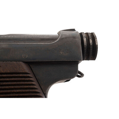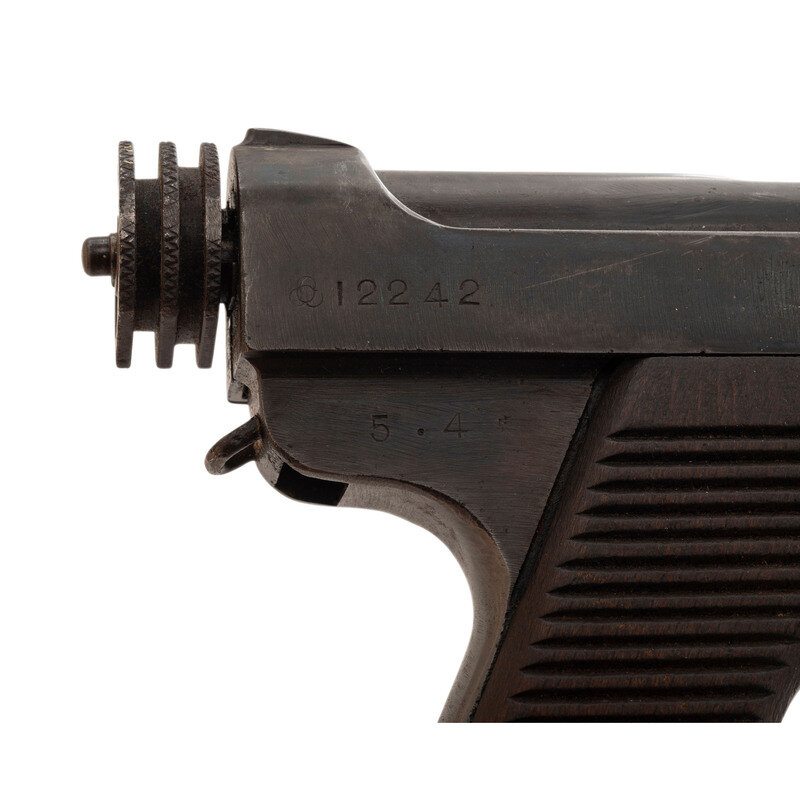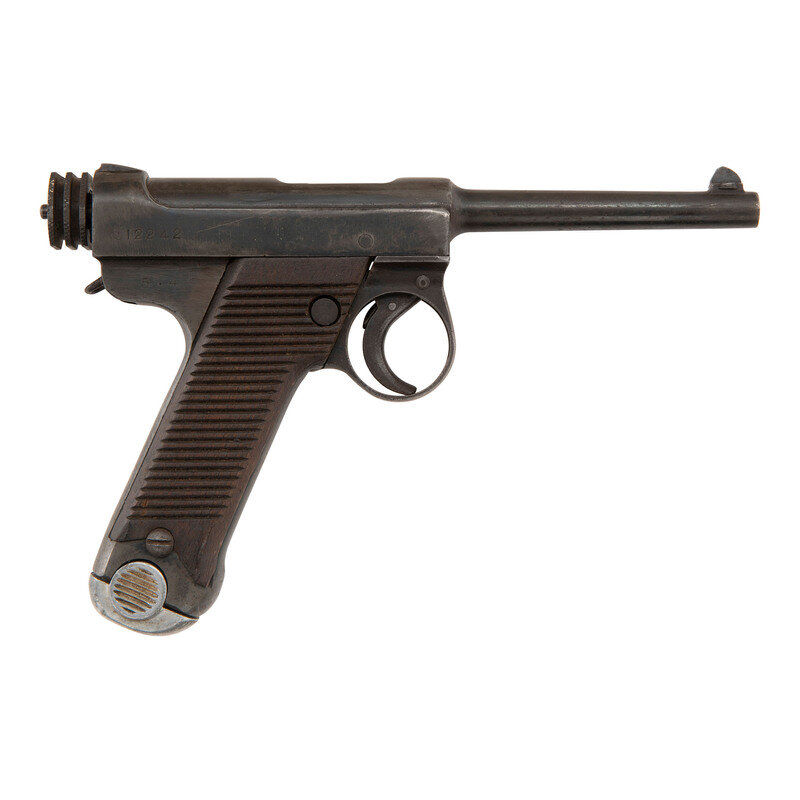 8mm Nambu. 4.6" barrel. SN: 12242. Blued finish, 25-groove Asian hardwood slab style grip panels. Short recoil operated fixed barrel magazine fed semiautomatic pistol with small triggerguard, fixed notch rear sight, dovetailed blade front sight, and safety lever. Standard markings on fame with a Showa date of 5.4 (April of 1930) and Tokyo Arsenal mark. Matching serial numbers on frame, trigger and bolt. Aluminum base nickel plated magazine mismatched and numbered 961.