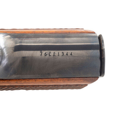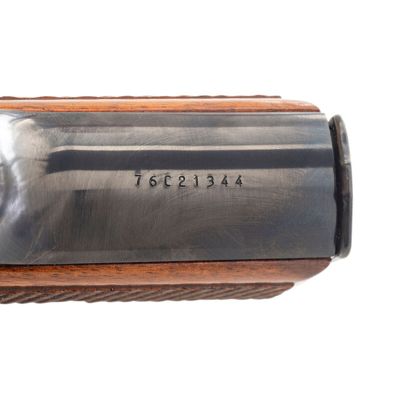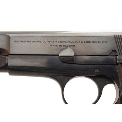 9mm Para. 4.7" barrel length. SN: 76C21344. Blued metal finish overall with polished barrel and mounting checkered walnut grip panels with red painted interiors. Short-recoil operated single action autoloading pistol fed by detachable double stack magazines and mounting standard fixed sights. Left slide is marked BROWNING ARMS COMPANY MORGAN, UTAH & MONTREAL P.Q./MADE IN BELGIUM. Belgian firing proofs are struck into the major components. Item comes with one blued magazine with the marking GP35 Cal. 9MM struck into the body.