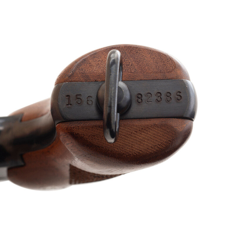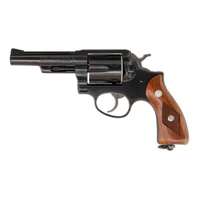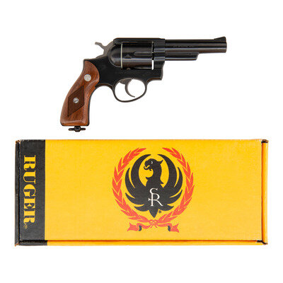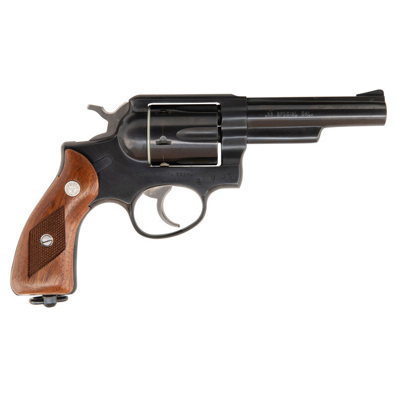 .38 Special. 4" barrel length. SN: 156-82386. Blued metal finish with polished hammer and trigger and mounting checkered walnut Ruger medallion grips and a lanyard loop to the butt. Double action hand ejector six shot revolver mounting topstrap notch and pinned matted front ramp sights atop a matted barrel rib. Right frame is struck U.S. beside {Ruger Logo} with model marking RUGER MODEL SS84L. Left barrel exhibits the two-line address STURM, RUGER & CO. INC./SOUTHPORT, CONN. U.S.A. Comes in a yellow RUGER marked cardboard box with cardboard sleeve marked with matching serial number.