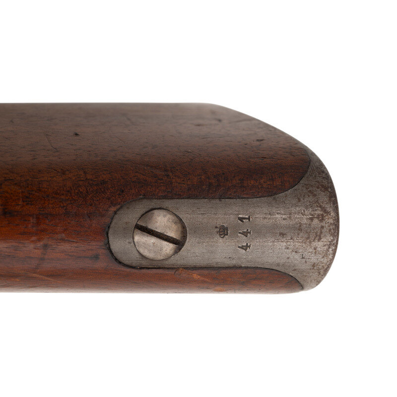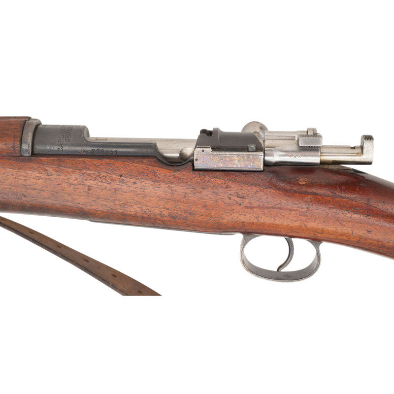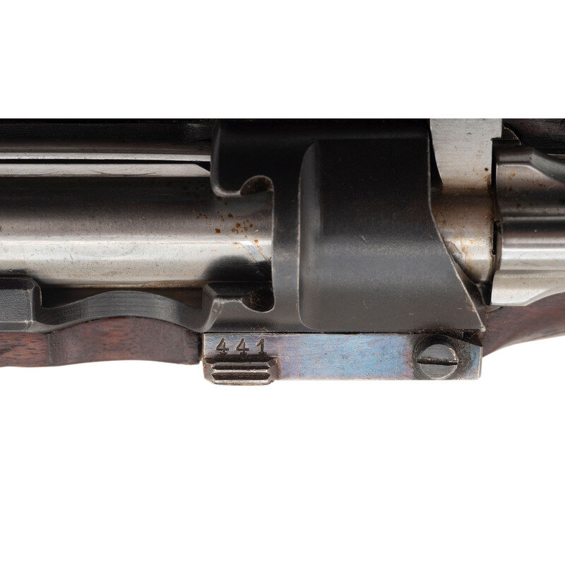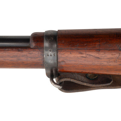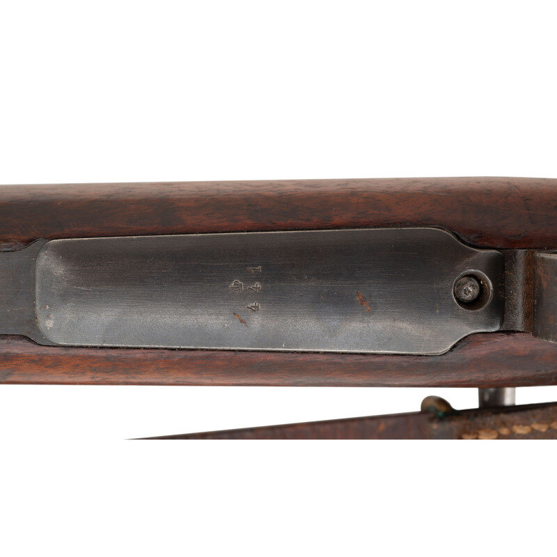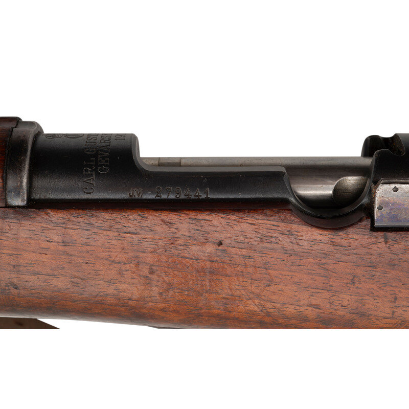6.5x55mm Swedish. 29" barrel length. SN: 279441. Blued metal finish and polished steel bolt. Walnut stock has a plain straight grip and forearm, with handguard and grasping grooves. Bolt action rifle with adjustable tangent notch rear sight and blade front sight. Item features an internal magazine, bayonet lug forend, double sling swivels, and threaded muzzle with cap. Includes a brown leather sling. Markings include Carl Gustafs manufacturer marks and a 1911 date to receiver.