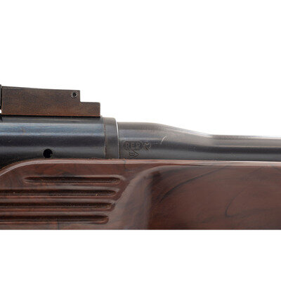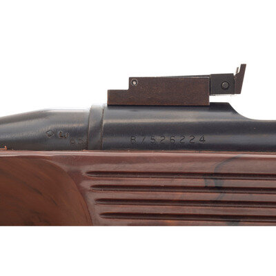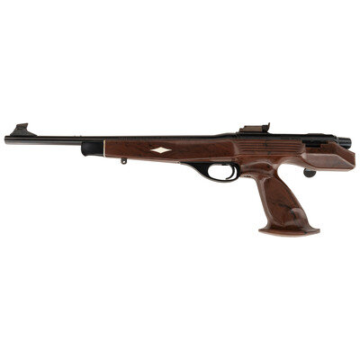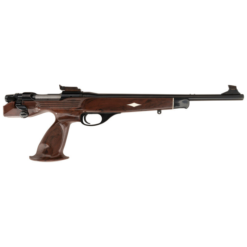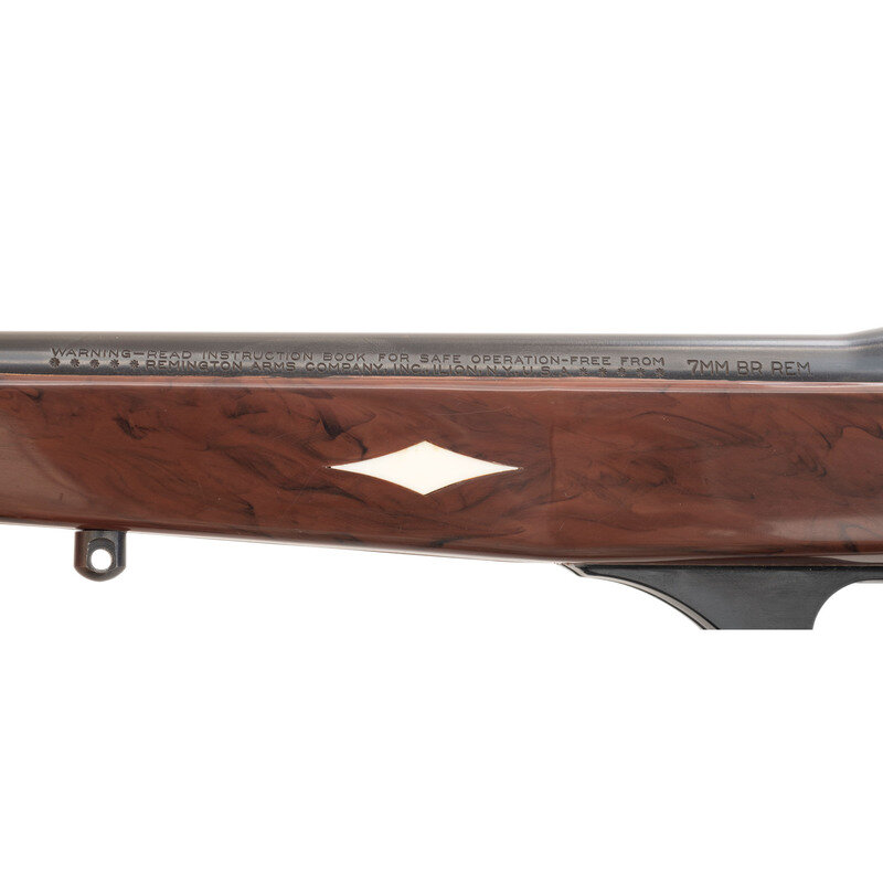 7mm BR. 15" barrel length. SN: B7526224. Blued metal finish with polished bolt set in a brown synthetic stock with white synthetic Diamond inserts and black forend cap. Single shot bolt-action pistol mounting adjustable target rear notch and dovetailed Patridge front blade sights. Left receiver is drilled and tapped and the stock cut to permit mounting a peep sight, while the forward barrel is drilled and tapped with thread protecting screws in place for optics mounting. Model markings on the receiver read Remington/MODEL XP-100. Standard two-line markings on the left barrel read WARNING-READ INSTRUCTION BOOK FOR SAFE OPERATION-FREE FROM/REMINGTON ARMS COMPANY, INC., ILION, N.Y., U.S.A.