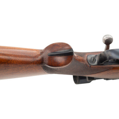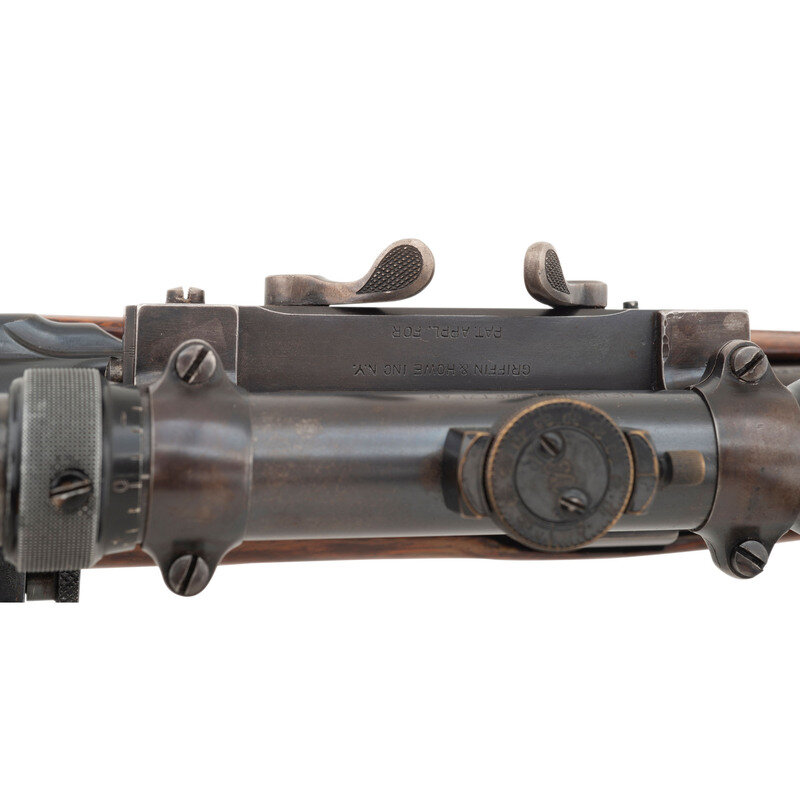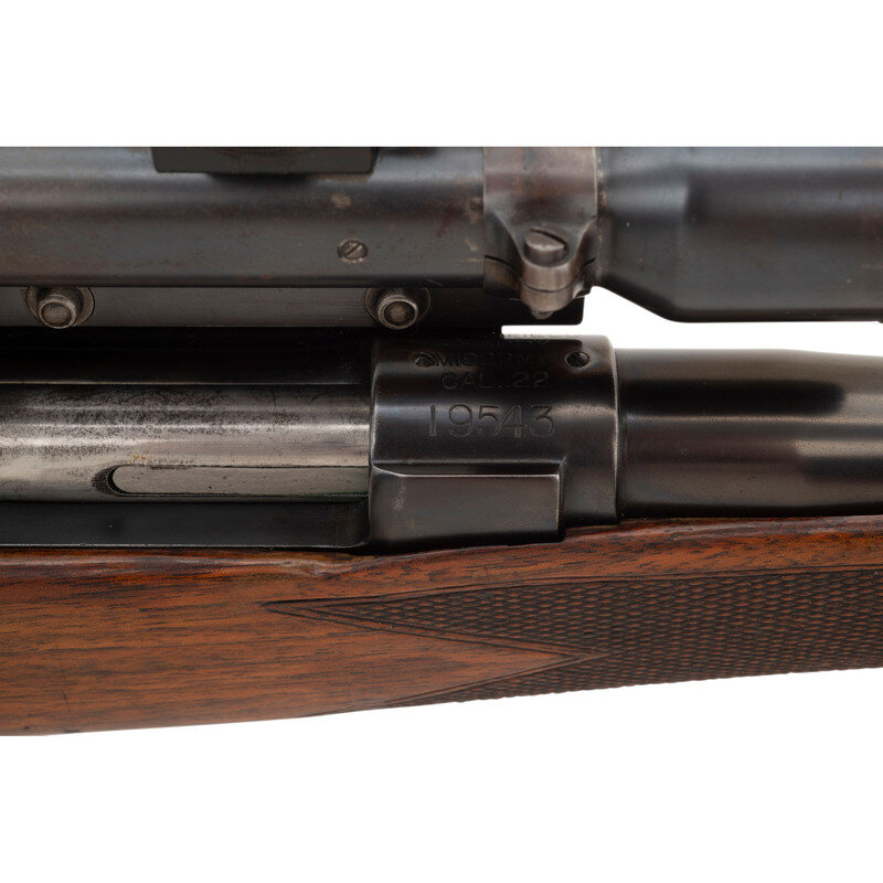 .22 Hornet. 24" barrel length. SN: 19543. Blued metal finish. Fancy walnut stock has checkering to semi pistol grip and forearm, with ebony inlays to forend, scalloped grip, and sides of forearm. Bolt action rifle with a Hensoldt-Wetzler 4x scope and globe post front sight with stippled ramp and changeable insert. Item features a Griffin & Howe quick detach scope mount, stippled bolt handle, internal magazine, double sling swivels, and a rubber recoil pad. Barrel only has .22 HORNET marks and is drilled and tapped for a rear sight. Other markings include U.S./SPRINGFIELD/ARMORY/M1922MI/19543 to receiver.
