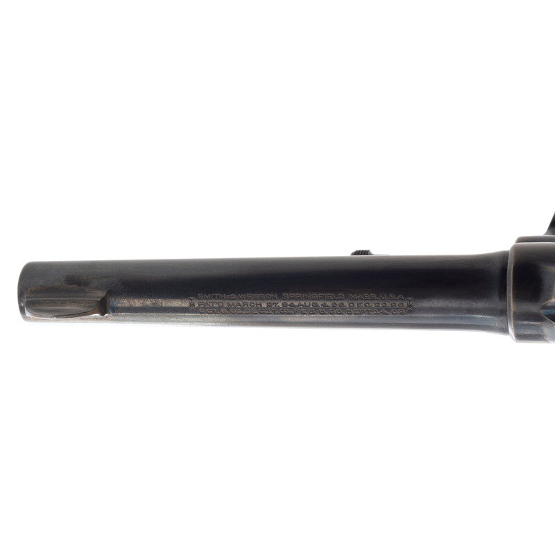 .32 S&W Long. 4.25" barrel length. SN: 207676. Blued metal finish with casehardened hammer and trigger mounting black synthetic Smith & Wesson monogram grips. Double action hand ejector six-shot revolver with topstrap notch and half-circle front blade sights. Item features a pinned barrel, five screw frame, and a Smith & Wesson monogram trade mark to the sideplate. Further marks include caliber mark to the left barrel and a three-line address and patent mark to the top of the barrel. SMITH & WESSON SPRINGFIELD MASS. U.S.A./PAT'D MARCH 27. 94. AUG. 4. 96. DEC. 22. 96/OCT. 8. 01. DEC. 17. 01. FEB. 6. 06. SEPT. 14. 09. Serial numbers match on the barrel, cylinder, and star extractor.