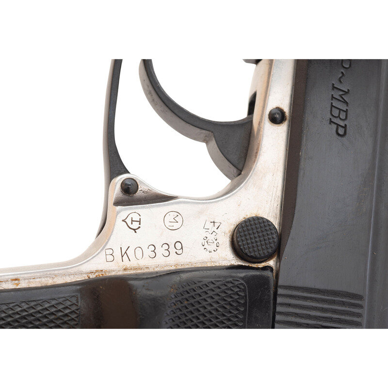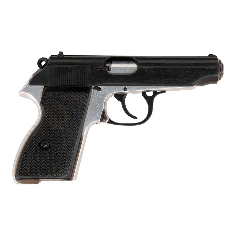 .32 ACP. 3.9" barrel length. SN: BK0339. Blued metal finish with aftermarket polished alloy frame mounting checkered black synthetic thumb rest grips and fixed low-profile sights. Simple blowback operated DA/SA autoloading pistol fed by detachable single-stack magazines. Item features a slide mounted safety/de-cocker and thumb release for the magazine just behind and above the trigger. Markings include Hungarian inspection stamps to the left frame and Made in Hungary/FEG Budapest to the right slide. Left slide is struck with the caliber and model marking 7.65mm AP~MBP. Importer marking below the frame reads TGI/KNOX/TN. Item comes with two magazines.