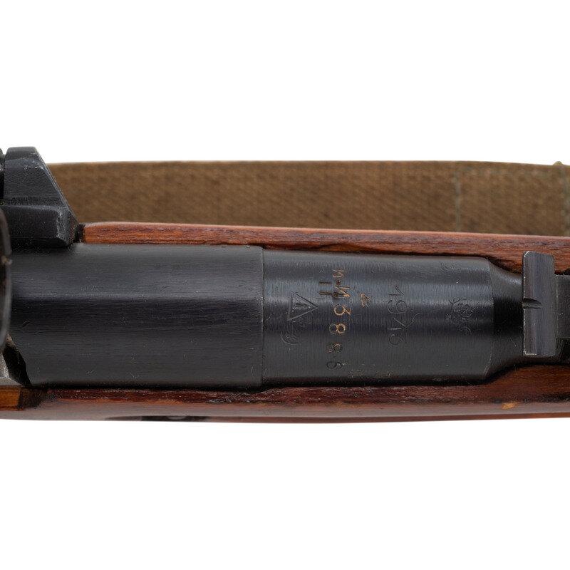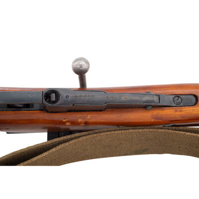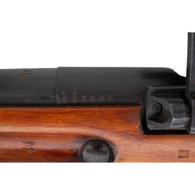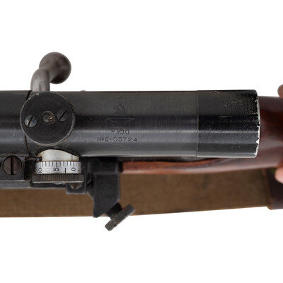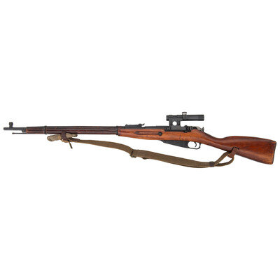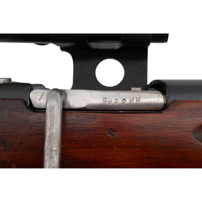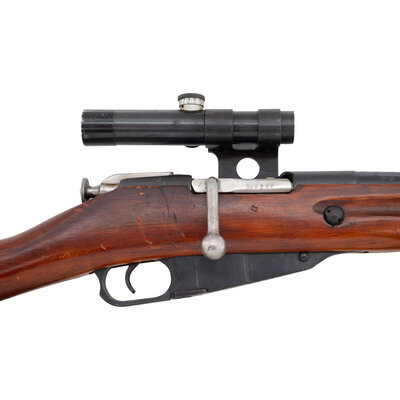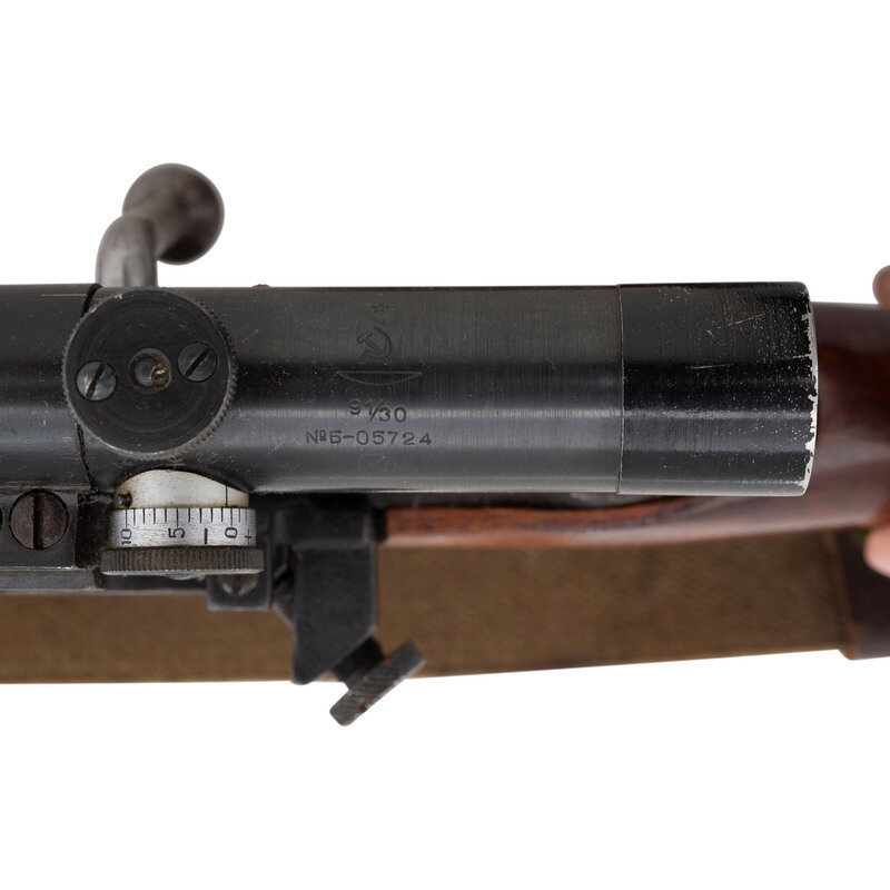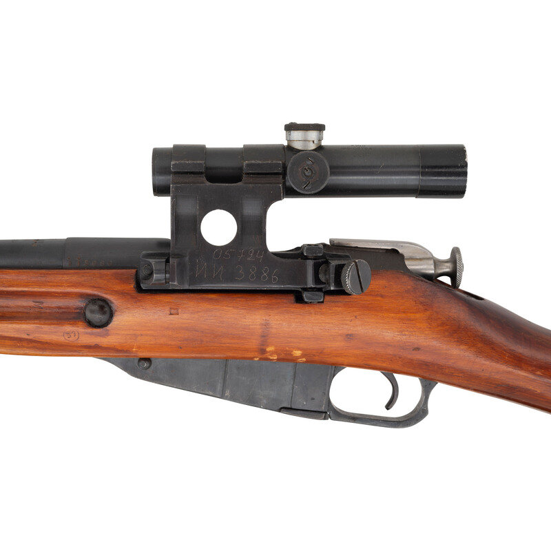 7.62x54mmR. 29" barrel length. SN: II3886. Blued metal finish with polished bolt set in a full length Birchwood flat wrist stock and mounting a 3.5X PU telescopic sight. Bolt action repeating rifle featuring a side mounted scope mount that overhangs the iron sights, permitting both the scope and the adjustable rear notch and fully hooded front post to be operated without dismounting the optic. Receiver shows the {Arrow within Triangle} mark indicating it was manufactured by Izhevsk Arsenal, along with the 1943 date marking. The left receiver displays the serial number assigned by the importer and reported above with the original serial number matching on the barrel, bolt, and scope base. Number is force matched on the magazine floorplate. Scope base displays both the serial number of the rifle and the serial number for the currently mounted scope applied via electro-pen. Top of the scope shows the {Star/Sickle and Hammer} marking followed by 91/30 mark and the serial number No. 05724. The receiver and the scope both show a {Boxed X} marking indicating it was put through post-war refurbishment. Comes with a Soviet cleaning kit without bore brush, a canvas sling showing weak production stamps, and a cleaning rod. Importer marking to the right barrel reads C.A.I. ST ALB. VT/M91/30 RUSSIA 762X54R.