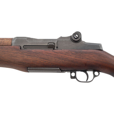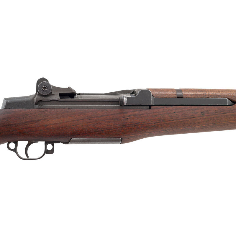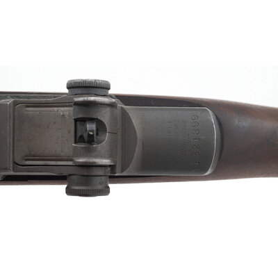 .30-06. 24" barrel length. SN: 1321399. Parkerized metal finish overall mounting walnut semi-pistol grip stock and T105 pattern sights. Long-stroke piston gas operated rifle utilizing a rotating bolt and fed by an internal box magazine charged with en-bloc clips. The serial number marking indicates the receiver was manufactured in April, 1943, with the manufacturer mark reading U.S. RIFLE/CAL. .30 M1/WINCHESTER/TRADEMARK above the serial number. The majority of observed drawing numbers indicate Winchester manufacture, but the barrel and operating rod both bear Springfield Armory stamps, indicating they were installed during postwar refurbishment. Bolt drawing number D28287-1 W.R.A. appropriate for wartime production. Cut operating rod D35382 SA correct for cut operating rods installed on post-war rebuilds. The trigger housing is marked D28290-W.R.A. while the hammer shows D-46008-1 W.R.A. Both are correct for wartime production. The receiver drawing number reads D28291-2. Item mounts a Type 2B style stock showing Springfield style cuts and a weak Circle P proof on the wrist, indicating it was sanded at some point. The barrel date marking reads 1-S-A-12-44, indicating it to be a World War II production barrel that was installed during refurbishment. Electro-pen mark to the right receiver reads LEAD/4-64. Stock is void of tools. Item shows a muzzle erosion reading of 1 and a throat reading of 1.