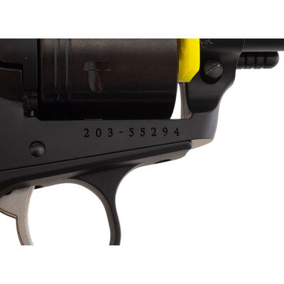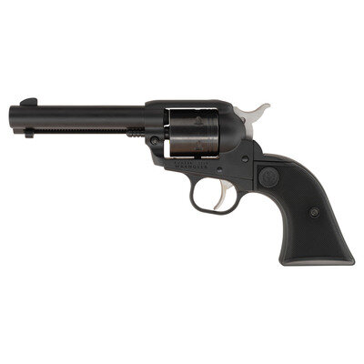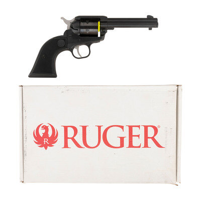 .22 LR. 4.675" barrel length. SN: 203-55294. Black Cerakote finish with DLC finish to cylinder, matte hammer and trigger, and mounting checkered black synthetic Ruger logo grips. Single action six-shot hand ejector revolver featuring topstrap notch and front blade sights, and a transfer bar safety mechanism. Standard make and model markings appear overall including RUGER 22 LR/WRANGLER to the left frame and two-line warning and address mark below the barrel. Comes in a matching cardboard box with the owner's manual, a Ruger logo marked leather outside waistband holster, and a cable lock in package.