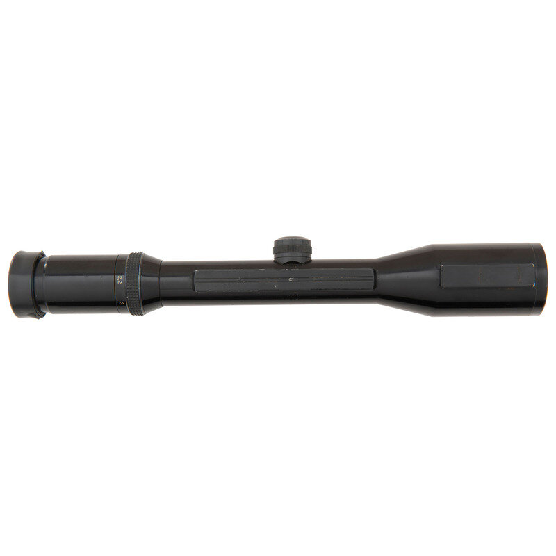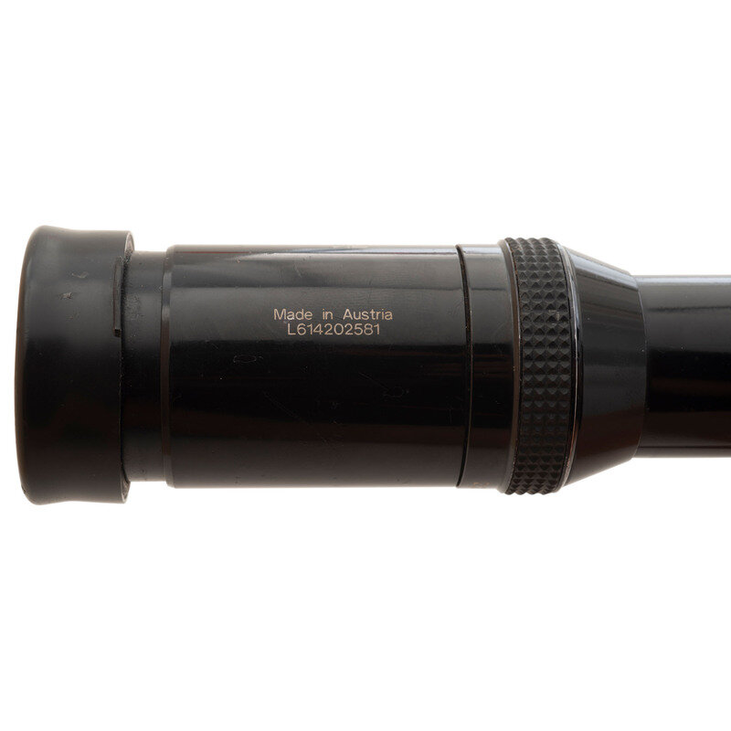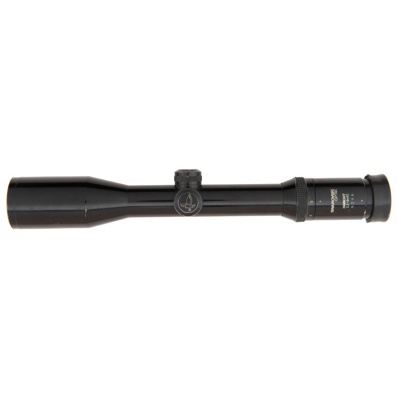 13.5" x 2.25". Black painted finish overall with rubber eyepiece and featuring a dovetail rail built into the scope intended for use with LM rail mounts. Scope shows the maker marking SWROVSKI/OPTIK/HABICHT/2,2-9x42/NOVA with serial number marking reading Made in Austria/L614202581. Scope retains its turret protectors. The scope base has been bored through in two places below the objective and in one place beneath the body for securing screws.