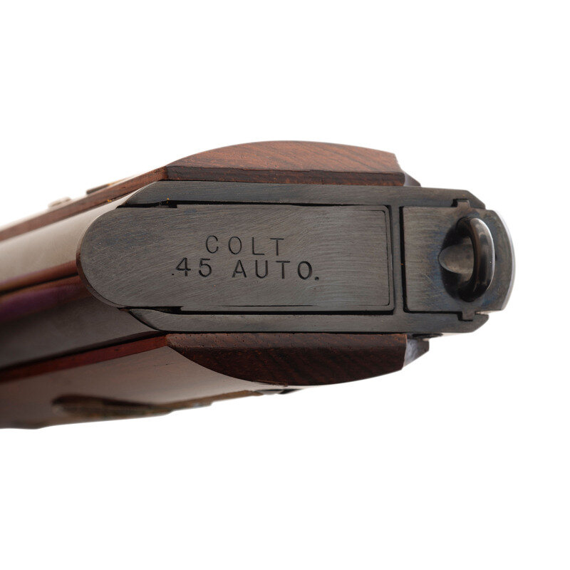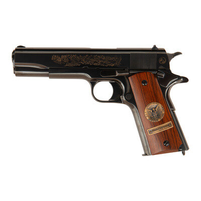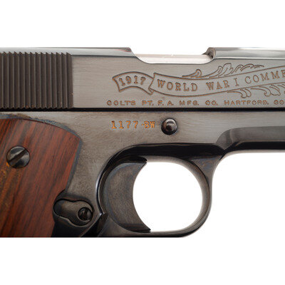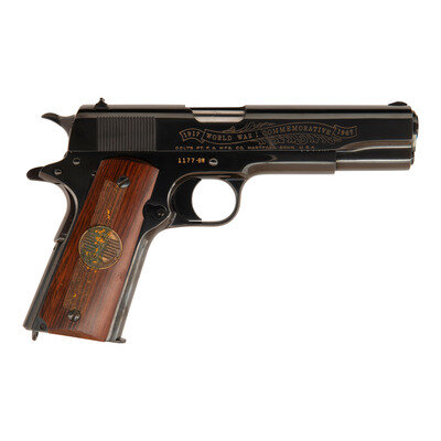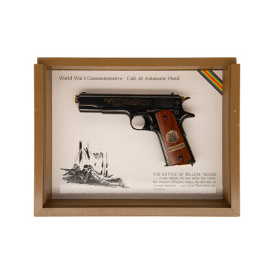 .45 ACP. 5" barrel length. SN: 1177-BW. Blued metal finish with polished barrel and hammer flanks mounting smooth walnut grip panels. Short-recoil operated single action autoloading pistol fed by detachable single stack magazines and commemorating the World War I Battle of Belleau Wood. Right slide has been engraved with gold banner reading 1917 WORLD WAR I COMMEMORATIVE 1967 above the single-line address reading COLT'S PT. F.A. MFG. CO. HARTFORD, CONN. U.S.A. Left side features {American Lewis Gunners covering an advance through the woods} forward of the cocking serrations and with a circled {Rampant Colt} logo behind. Grip panels feature bronze medallions with the left marked 1917 1918/WORLD WAR I surrounding {United States Eagle} above a banner reading BELLEAU WOOD. The right grip panel mounts a medallion featuring {US Army "Doughboy"} surrounded by the names of all the Allied nations and above a banner reading THE GREAT WAR FOR CIVILIZATION. Item comes in a wood display case painted OD green with the interior face reading World War I Commemorative Colt .45 Automatic Pistol with the Rainbow banner to the upper right corner. Lower left features {American machine gun crew in a wooded position with the silhouettes of advancing Americans behind}. The lower right corner is marked THE BATTLE OF BELLEAU WOOD/"...it was, indeed, the one battle that halted/the German offensive, began the ebb tide of/German fortunes... and saved Paris from oc-/cupation...." Back side of the display case features an insert with further information about the battle along with a cable mount. Included with the handgun are one magazine and the owner's manual.
