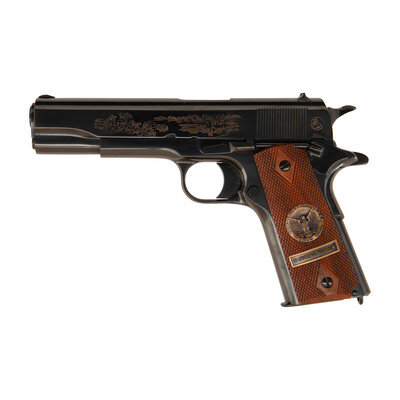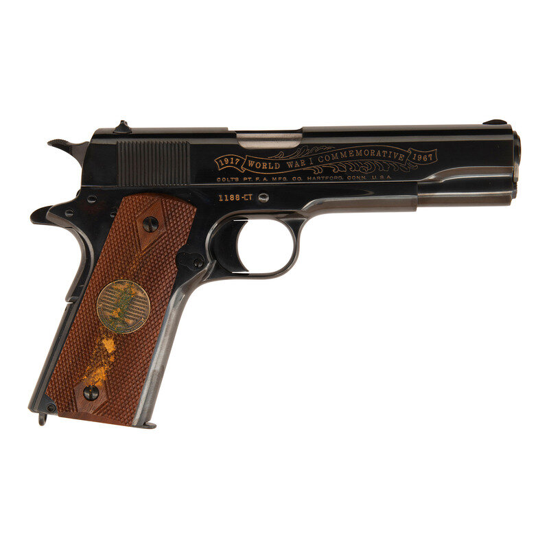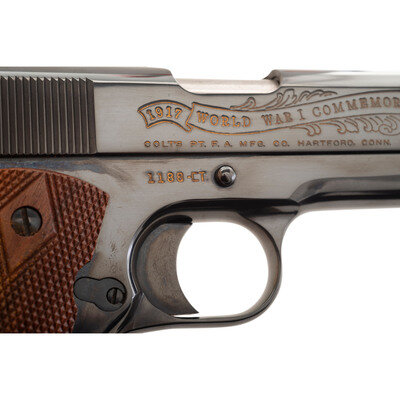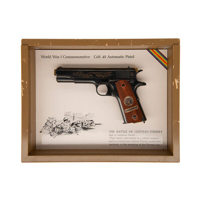 .45 ACP. 5" barrel length. SN: 1188-CT. Blued metal finish with polished barrel and hammer flanks and mounting diamond checkered walnut grip panels. Short-recoil operated single action autoloading pistol fed by detachable single stack magazines commemorating the World War I Battle of Chateau-Thierry. Item features the flat mainspring housing, broad hammer, and non relief-cut frame indicative of the Model 1911 pistols that served in World War I. Right slide features a gold banner reading 1917 WORLD WAR I COMMEMORATIVE 1967 above the single line address mark COLT'S PT. F.A. MFG. CO. HARTFORD, CONN. U.S.A. with the left slide engraved with {American Machine Gun position overlooking Chateau-Thierry} forward of the cocking serrations and a circled {Rampant Colt} logo behind. Left grip panel fitted with a medallion featuring the {Eagle of the United States} above a banner reading simply CHATEAU THIERRY. Right grip panel mounts a single medallion emblazoned with the names of the Allied nations surrounding {US Army "Doughboy"} above the banner reading THE GREAT WAR FOR CIVILIZATION. Item comes in an OD green painted display case featuring brass mounts for the firearm. The interior of the case features the {Rainbow Banner} of victory in the upper right corner along with the text World War I Commemorative Colt .45 Automatic Pistol above the mount and a paragraph below the mounts reading THE BATTLE OF CHATEAU-THIERRY/Said of the American Forces..../"Their timely intervention in a critical moment-/and in a critical spot, Chateau-Thierry, contributed/decisively to the stemming of the German tide". A further image of {An American Machine-Gun Position overlooking the Chateau} appears to the bottom left. The back of the case features a printed insert with further information about the battle itself, along with a cable hangar. Included with the pistol are one magazine and the owner's manual.