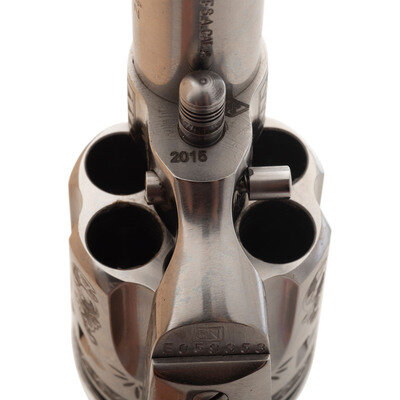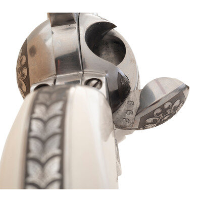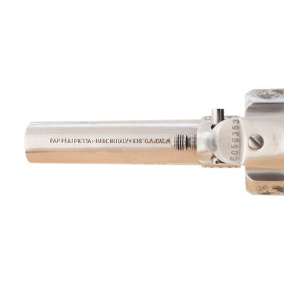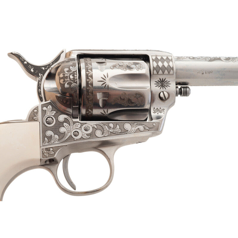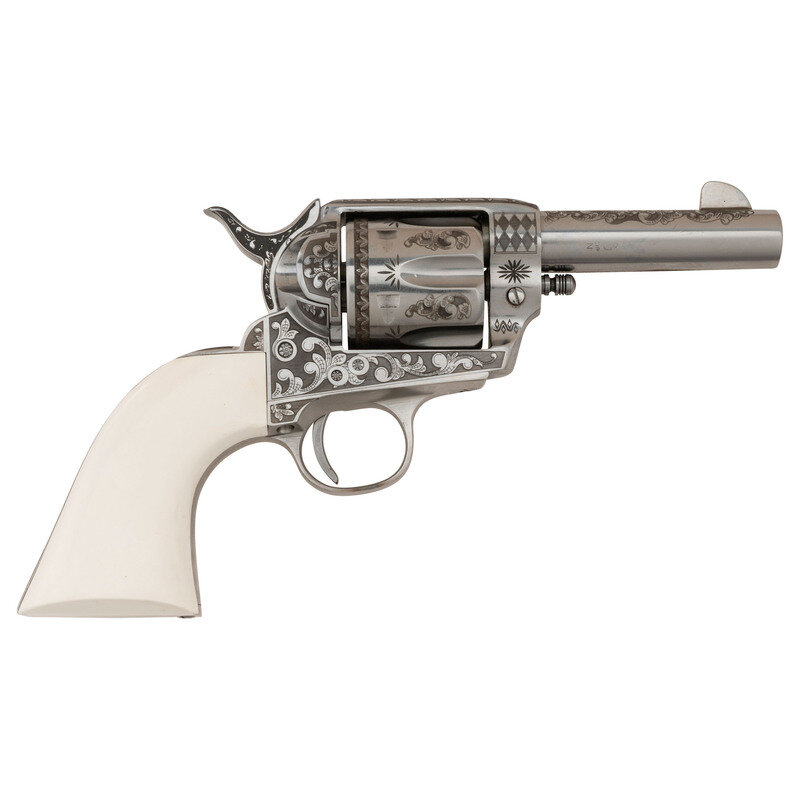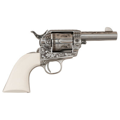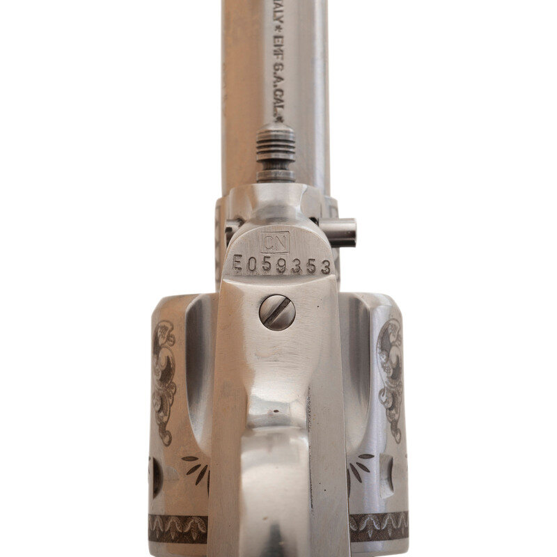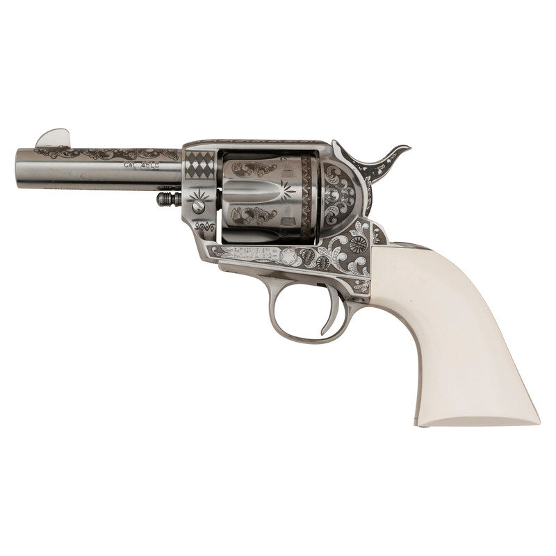 .45 Colt. 3.5" barrel. SN: E059353. Stainless steel finish, faux ivory grips. Replica single action army revolver with "smokeless powder" frame, no ejector rod, frame notch rear sight, blade front sight and six-chambered fluted cylinder. Revolver is laser engraved with flowing Arabesque scrolls resembling late 19th century engraving. Imported by EMF. Revolver includes the factory cardboard box with Styrofoam insert and paperwork.