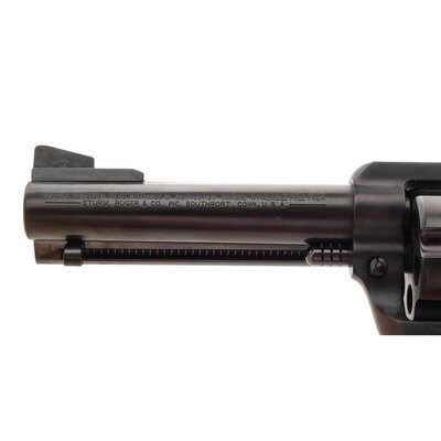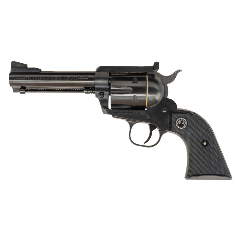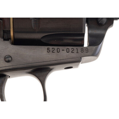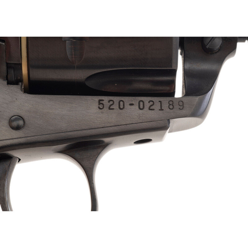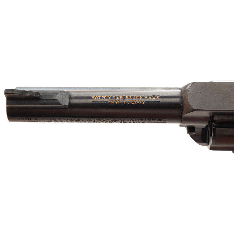.357 Magnum. 4.675" barrel length. SN: 520-02189. Blued metal finish with polished hammer flanks mounting black synthetic Ruger logo grips and a flat top frame. Single-action loading gate revolver with six shot cylinder featuring Micro adjustable target rear notch and matted front blade sights. Left frame shows the two-line model and caliber marking RUGER .357 MAGNUM CAL./NEW MODEL BLACKHAWK. Top of the barrel shows a two-line gold engraved marking reading 50TH YEAR BLACKHAWK/1955 TO 2005. Left barrel shows standard two-line instruction manual and address marking. Comes in matching red synthetic box with the owner's manual, padlock in package, and factory test casing in package.