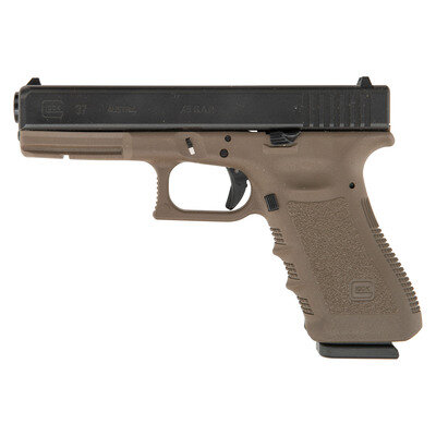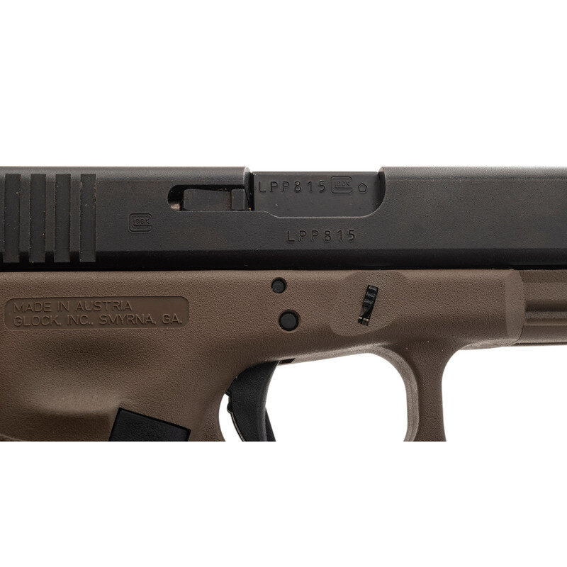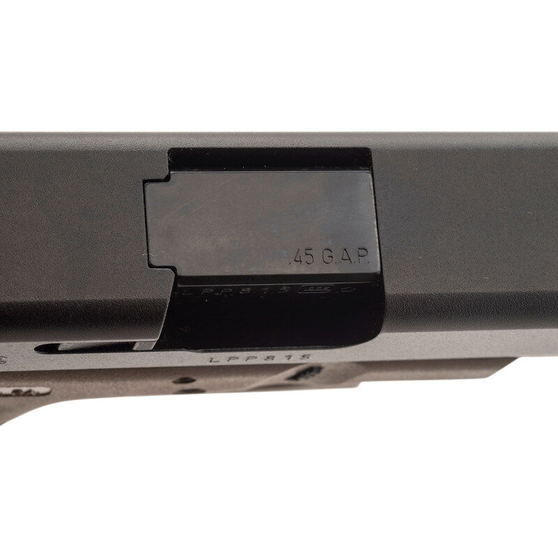 .45 GAP. 4.6" barrel length. SN: LPP815. Black Glock Gen 3 "Tenifer" finish to the slide with Flat Dark Earth synthetic frame featuring an accessory rail, and mounting standard Glock pattern sights. Short recoil operated striker-action autoloading pistol fed by detachable ten-shot magazines. Item shows standard Glock Austria markings, and comes in its original black synthetic hard case. Frame mounts an extended slide stop. Included in the case are three magazines, cable lock in package, nylon bore brush, synthetic cleaning rod, factory test casing in package, and owner's manual in package.