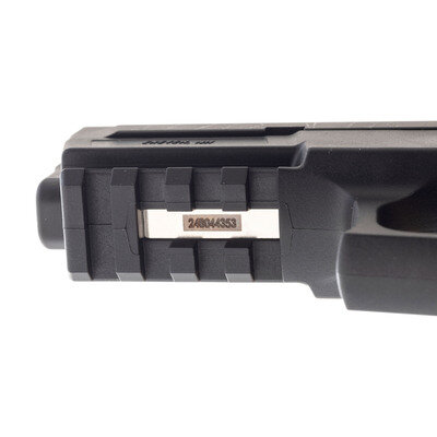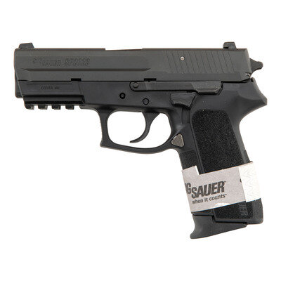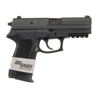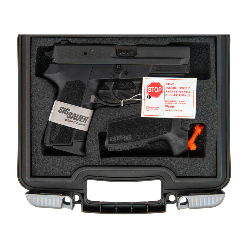 .40 S&W. 3.9" barrel length. SN: 24B044353. Nitron metal finish with black synthetic frame and grip panels mounting standard triple white dot factory sights. Short recoil operated DA/SA autoloading pistol fed by detachable double stack magazines. Item shows standard make and model markings for SIG USA. Comes in matching black synthetic hard case with one magazine, backstrap option, factory inspector tag, and cable lock in package.