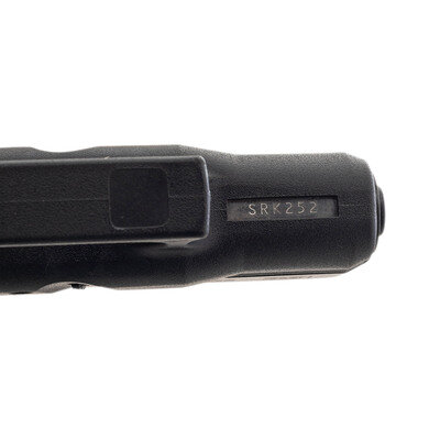 9mm Para. 3.42" barrel length. SN: SRK252. Black Glock Gen 3 "Frying Pan" finish with black synthetic frame featuring finger grooves and mounting standard Glock pattern sights. Short recoil operated striker action autoloading pistol fed by detachable single stack magazines. Standard Glock Austria markings on the slide and frame. Comes in a matching black synthetic hard case with three magazines, factory test casing in package, owner's manual, synthetic cleaning rod, nylon bore brush, and cable lock in package.