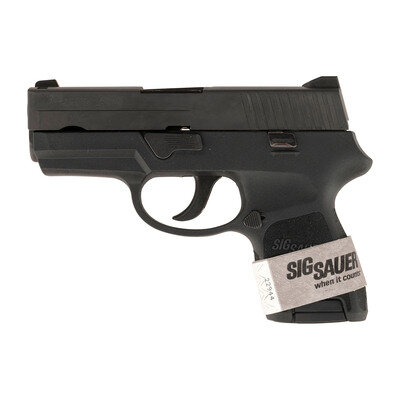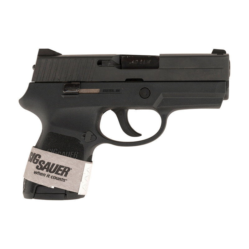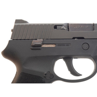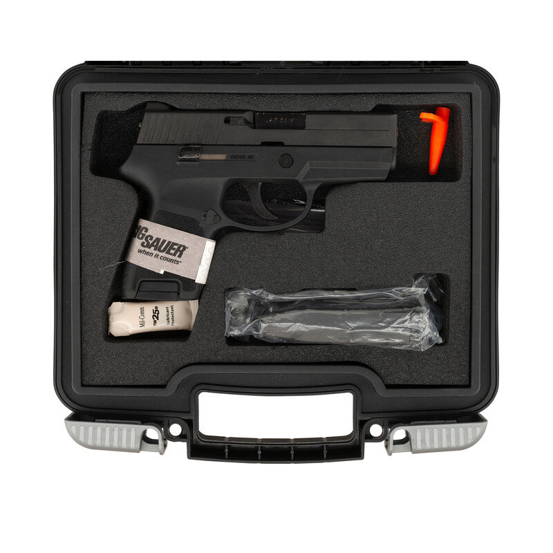 .40 S&W. 3.6" barrel length. SN: EAK032404. Black Nitron finish overall with black synthetic frame mounting triple white dot sights. Short recoil operated DAO autoloading pistol fed by detachable double stack magazines. Item is marked SIG SAUER P250 on the left slide with the right marked EXETER, NH. Comes in a matching black plastic hard case with two magazines, cable lock in package, and the owner's manual.
