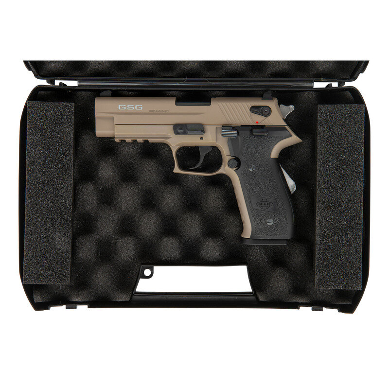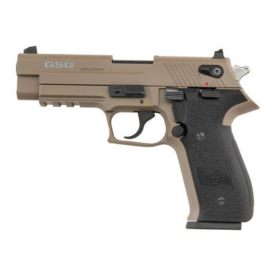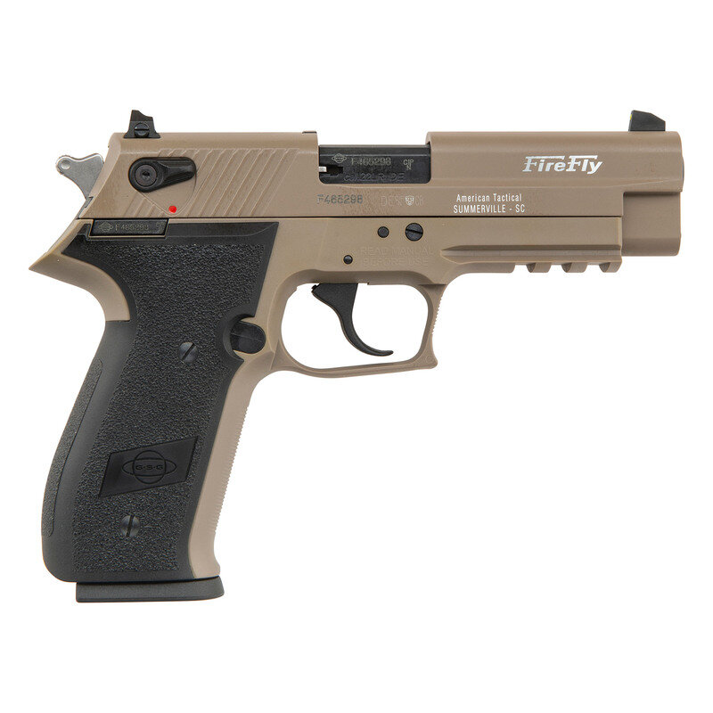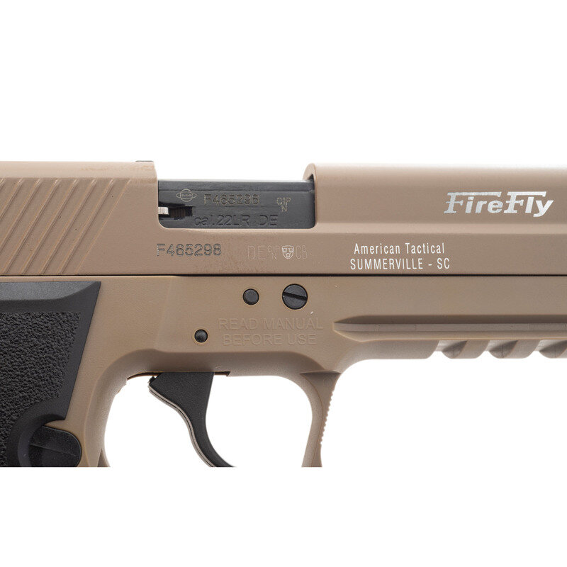 .22 LR. 4" barrel length. SN: F465298. FDE colored Cerakote finish to the slide with FDE frame and black Nitron finish to small parts mounting black synthetic GSG logo grips. Simple-blowback operated DA/SA autoloading pistol fed by detachable single stack magazines. Item is marked GSG and FireFly on the slide with the right slide additionally showing German proof marks followed by the importer marking American Tactical/SUMMERVILLE - SC. Comes in a matching black plastic hard case with one magazine, the owner's manual, extra recoil spring, and cable lock in package.
