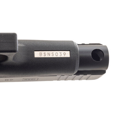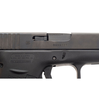 9mm Para. 4.17" barrel length. SN: BSNS039. Black Glock nDLC finish to metal parts with a black synthetic slender frame mounting standard Glock pattern sights. Short recoil operated striker action autoloading pistol fed by detachable double stack magazines. Item shows standard make and model markings overall, and comes with its original black synthetic hard case. Included with the pistol are two magazines, nylon bore brush, cable lock in package, and owner's manual in package.