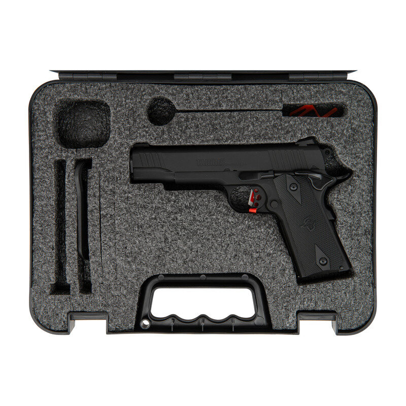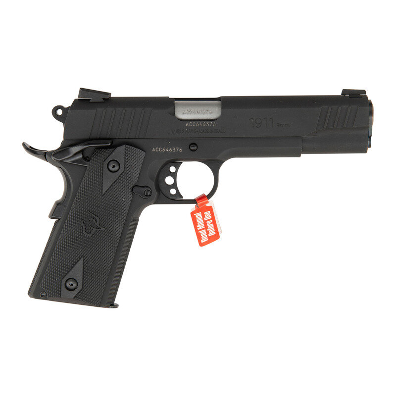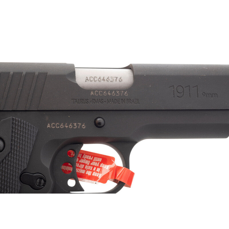 9mm Para. 5" barrel length. SN: ACC646376. Matte blued metal finish mounting diamond checkered black synthetic Taurus logo grips mounting NOVAKS triple white dot sights. Short recoil operated single-action autoloading pistol fed by detachable single stack magazines. Item shows standard markings including TAURUS BAINBRIDGE, GA on the left slide, and TAURUS ARMAS-MADE IN BRAZIL on the right followed by 1911 9mm model marking. Features include: front and rear cocking serrations, full length guide rod recoil spring, ambidextrous and extended safety lever, extended beavertail grip safety, extended magazine release, adjustable three hole trigger, Commander hammer, and knurled texture along the backstrap and forward gripstrap. Comes in a matching black synthetic hard case with one magazine, the owner's manual, and a bushing wrench.