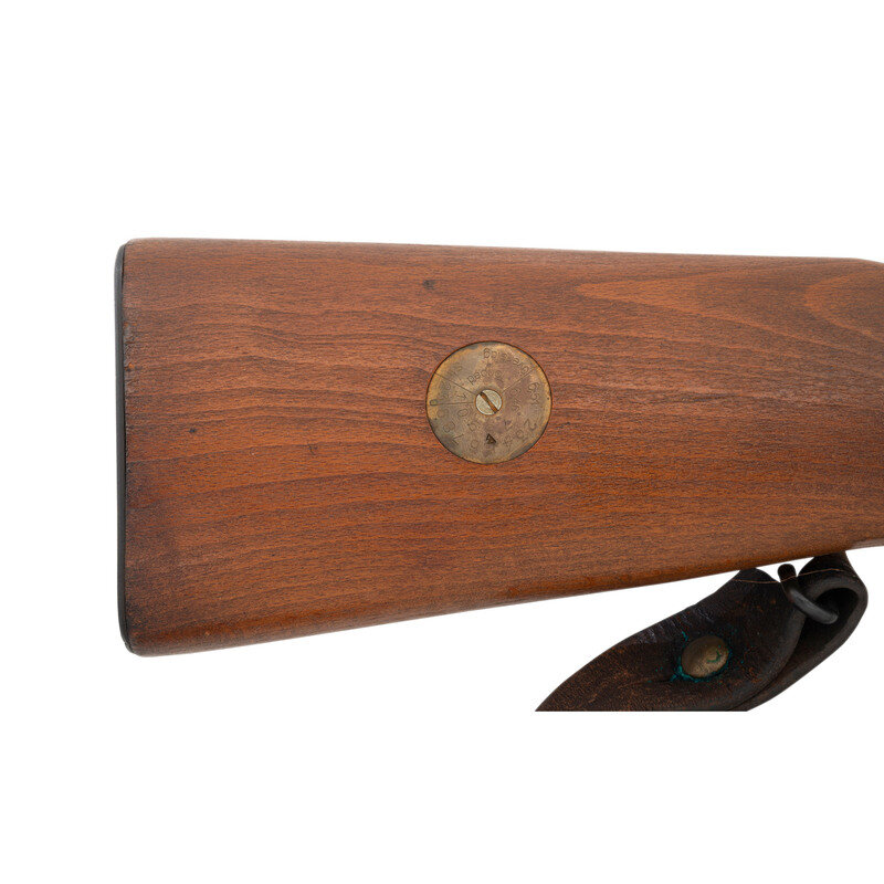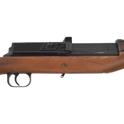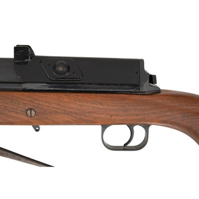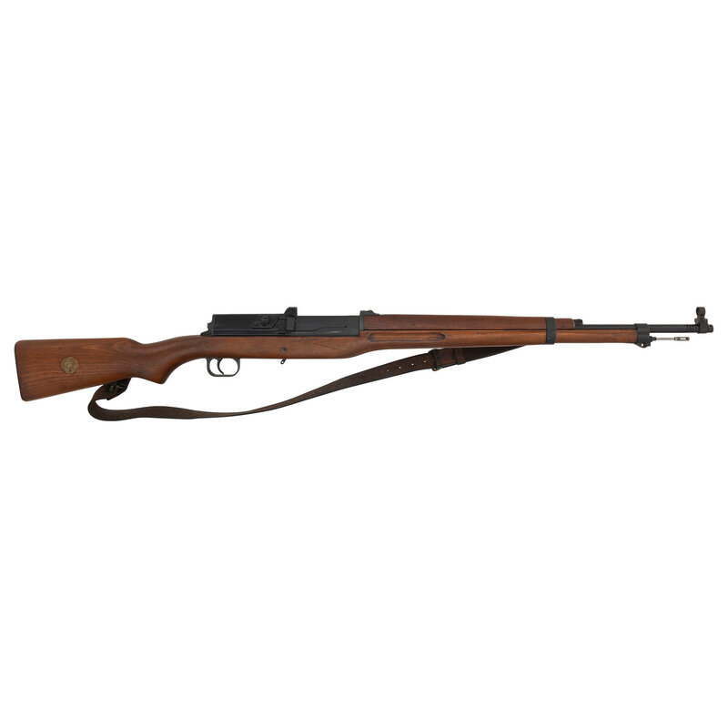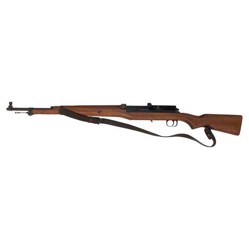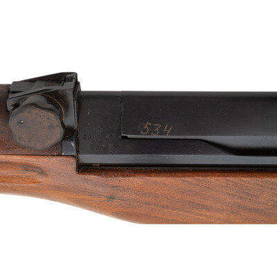 6.5x55mm Swedish. 25.5" barrel length. SN: 534B. Black metal finish to breech cover and blued metal finish to rest of parts. Walnut stock has a plain semi pistol grip and forearm, with forearm and grasping grooves. Gas operated semi automatic rifle with adjustable notch rear sight and globe post front sight. Item features a bayonet lug forend, side sling swivels, barrel ports, and AG-42B modifications such as dual lugs to breech cover and elevation knob for rear sight. Markings include 19{crown/C}43/534B marks and electro-penned serial numbers to receiver. Other markings include {crown/H} to tang, S.S. to right side of receiver, and several B marks. Includes a brown leather sling and slotted head cleaning rod. Item is without magazine.